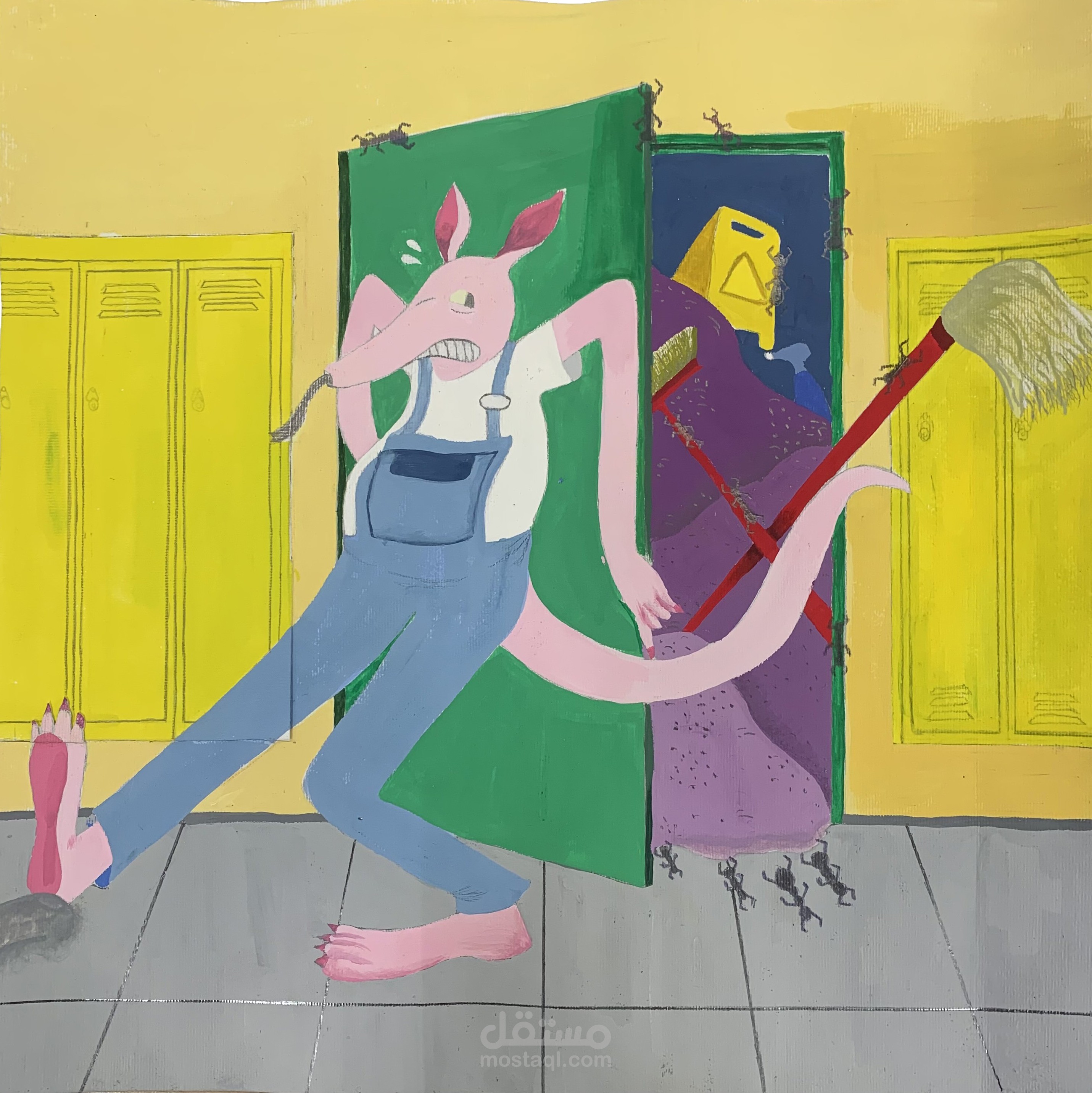 في هذا المشروع، قمت بإنشاء غلاف لكتاب للأطفال يتحدث عن آكل النمل الذي يعمل حارسًا في مدرسة النمل. يصور الغلاف صورة لبواب آكل النمل وهو يخفي النمل في خزانته ليتغذى عليهم لاحقًا. إنه نهج غريب الأطوار وممتع.