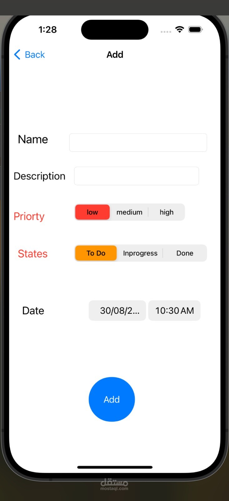 it's a to do list application using objective-c so the user can insert a task with a name, description and the date and chose what is its priority and its state so is it in progress or done or just to be created and listed in the to do list. The user can sort the tasks in each list and search for them.