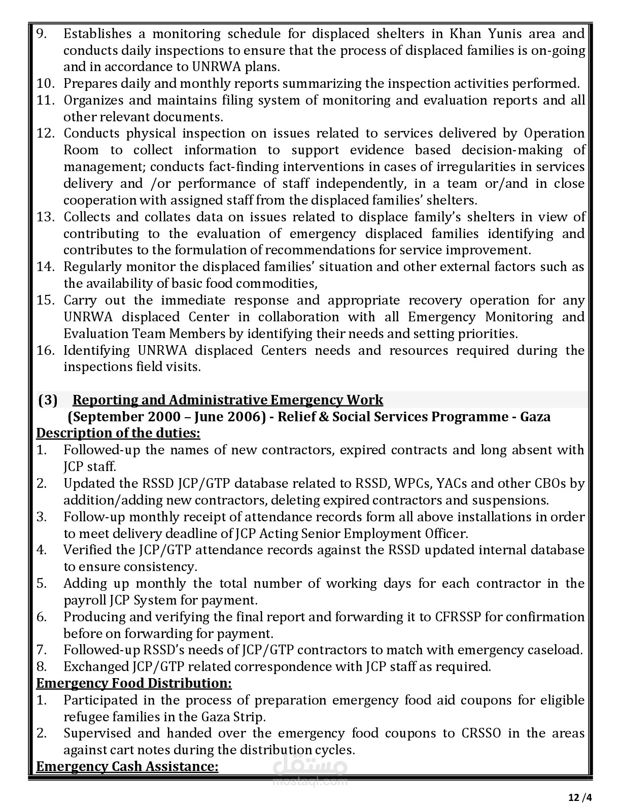 متابعة عقود العمل الخاصة بموظفي البطالة لدي دائرة الخدمات والشئون الاجتماعية، وإدخال وتحديث بيانات الموظفين، تدقيق لوائح دوامهم والسجلات الخاصة بهم، إعداد القوائم المالية الخاصة بهم، إصدار الكوبونات الخاصة بالمستحقين لها، والاشراف على إدارة عملية التوزيع. طباعة القوائم المعدة لذلك الغرض، الرد على رسائل الاستفسار الموجهة إلى المؤسسة والمشاركة في تحديث بيانات الطوارئ الخاصة بالدائرة. إعداد التقارير الشهرية وأخرى حسب الطلب.