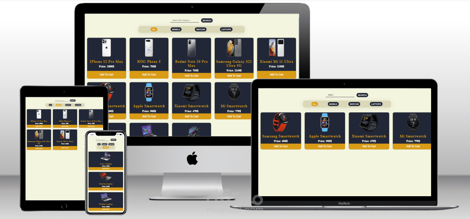 - **Category Filters:** Users can filter products by categories such as All, Mobile, Watches, and Laptops.