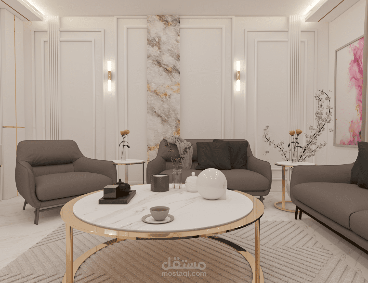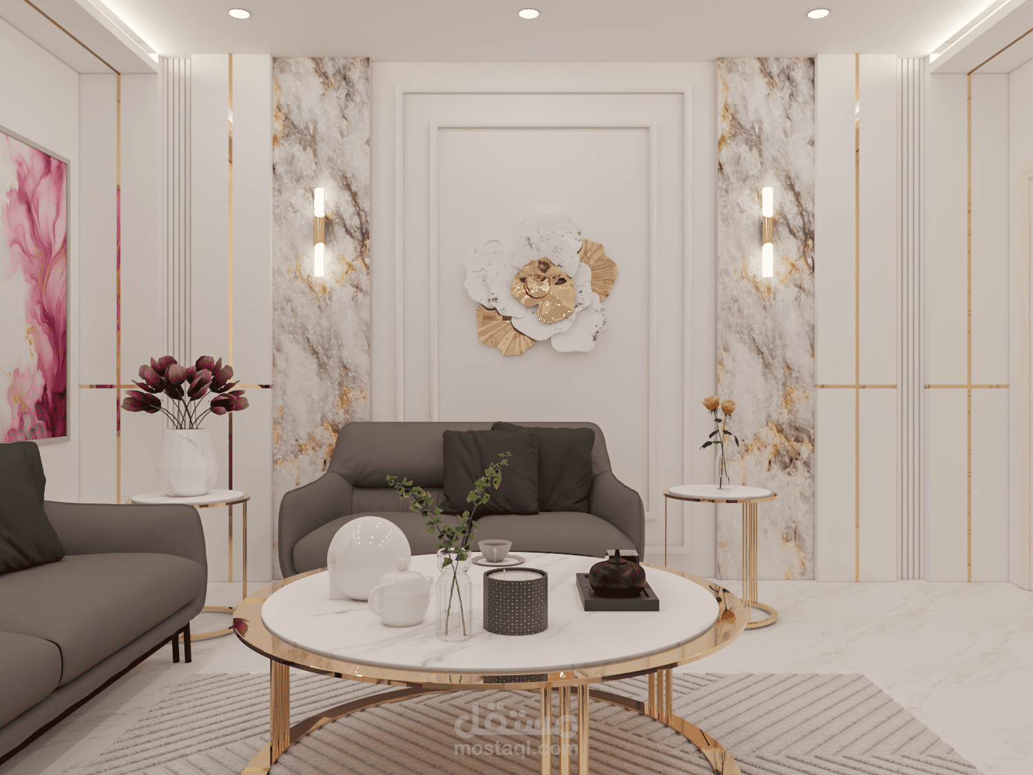 Contemporary and modern design. It is designed using elegant straight lines and the use of frames on the walls. Focused on the soft cream color and combined with brown with sophisticated finishes to create an elegant and comfortable atmosphere.