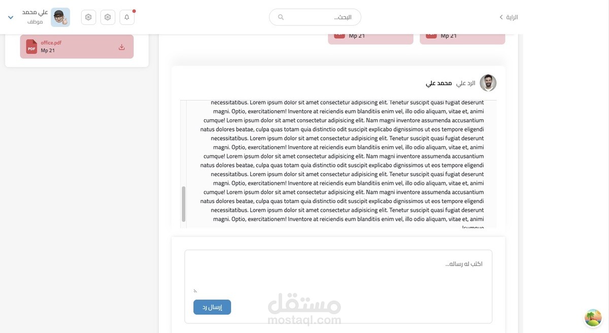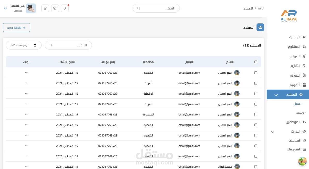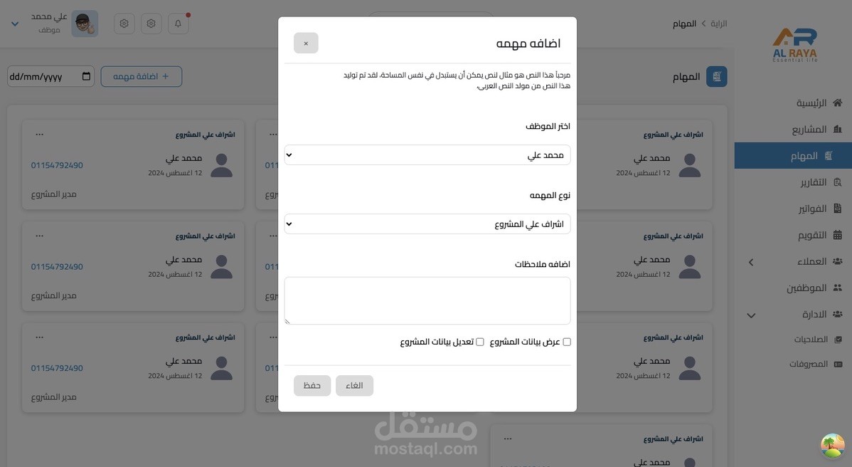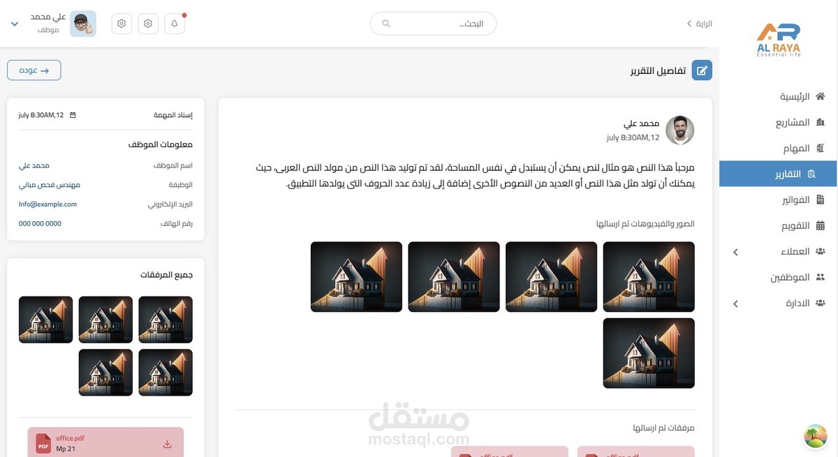 CRM for a real estate company to manage projects and employees, give them permission and tasks, and add reports and expenses. Also, the admin can talk to employees through the reports page.