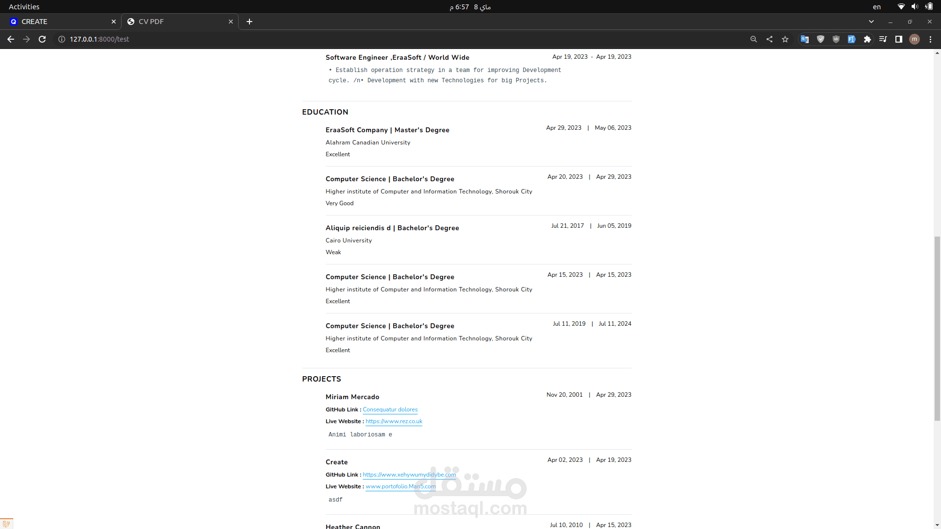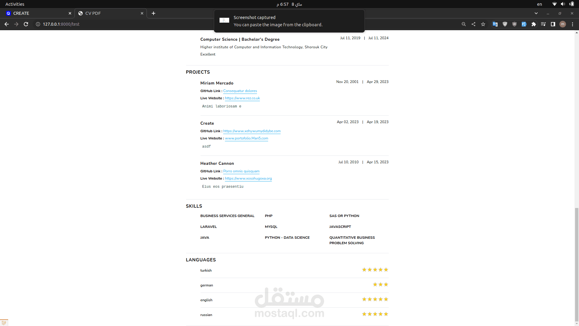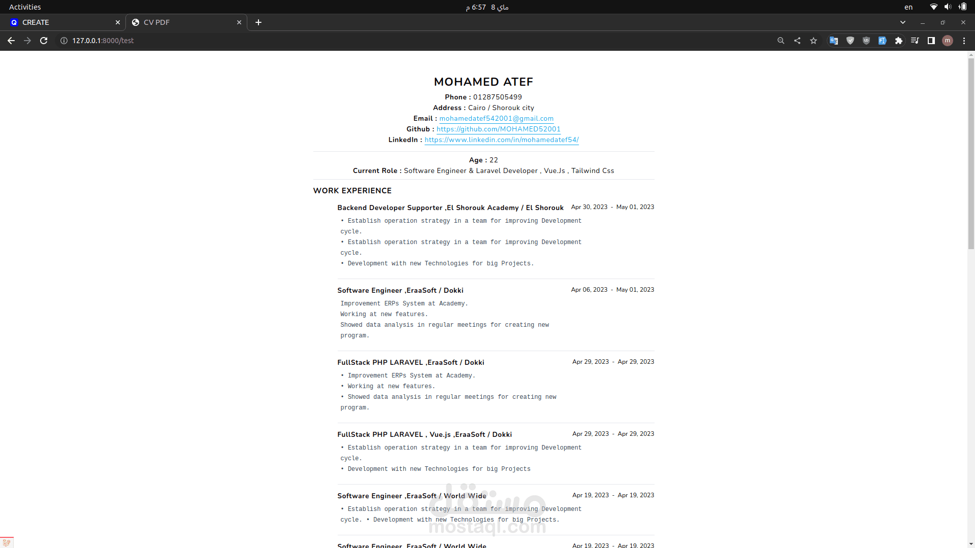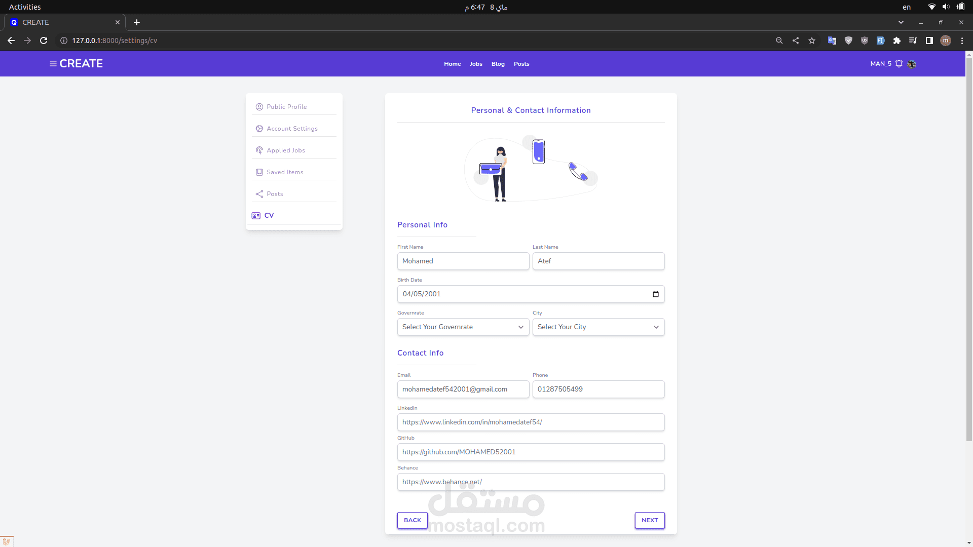 CV Builder: Users can build their CVs by adding data through form steps, including projects, work experience, languages, and more.