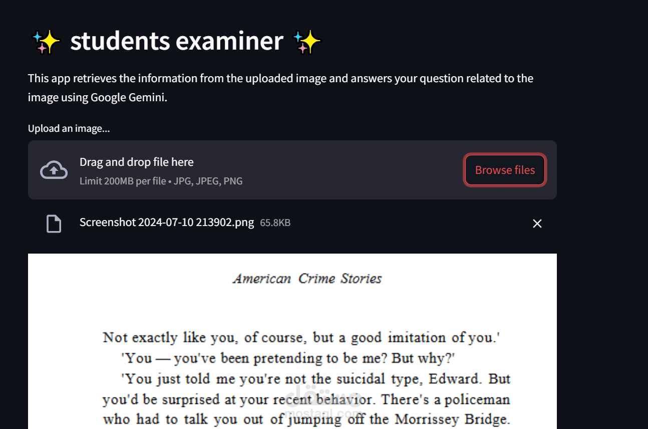 مشروعنا هو موقع إلكتروني تعليمي مبتكر مصمم لمساعدة الطلاب على تحويل النصوص المصورة من الكتب إلى أسئلة وأجوبة وبطاقات تعليمية تفاعلية. الهدف هو تسهيل عملية الدراسة وتحسين كفاءة التعلم.