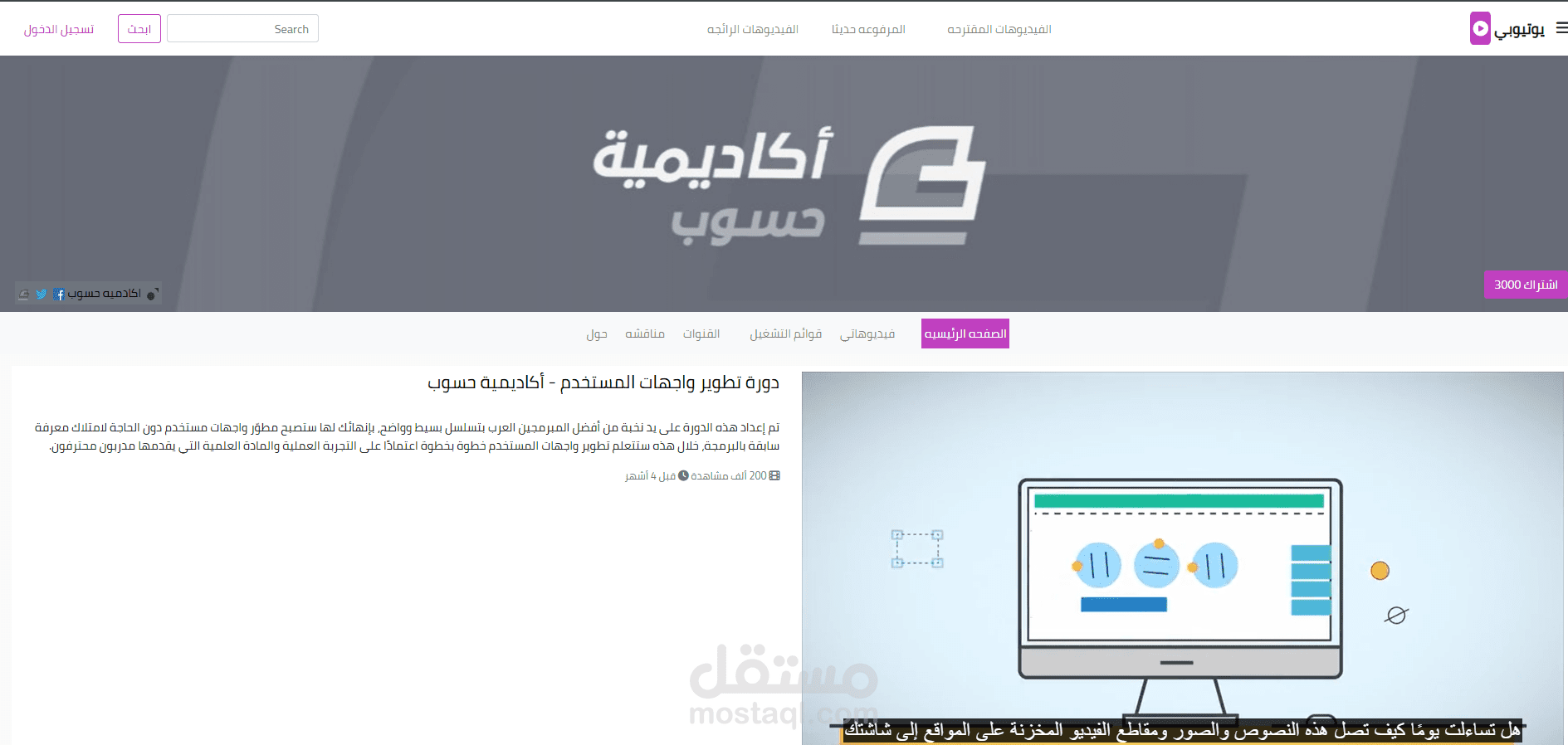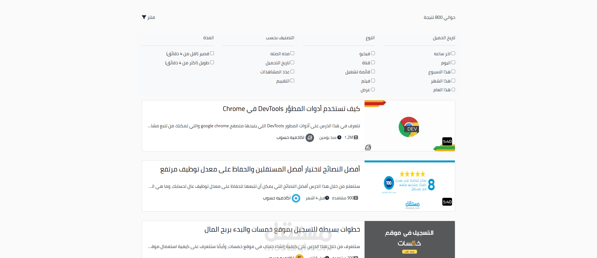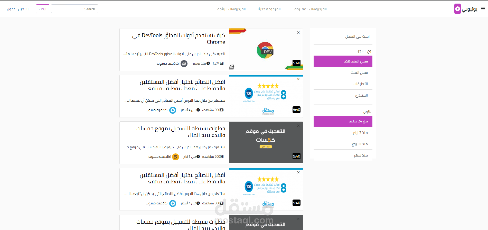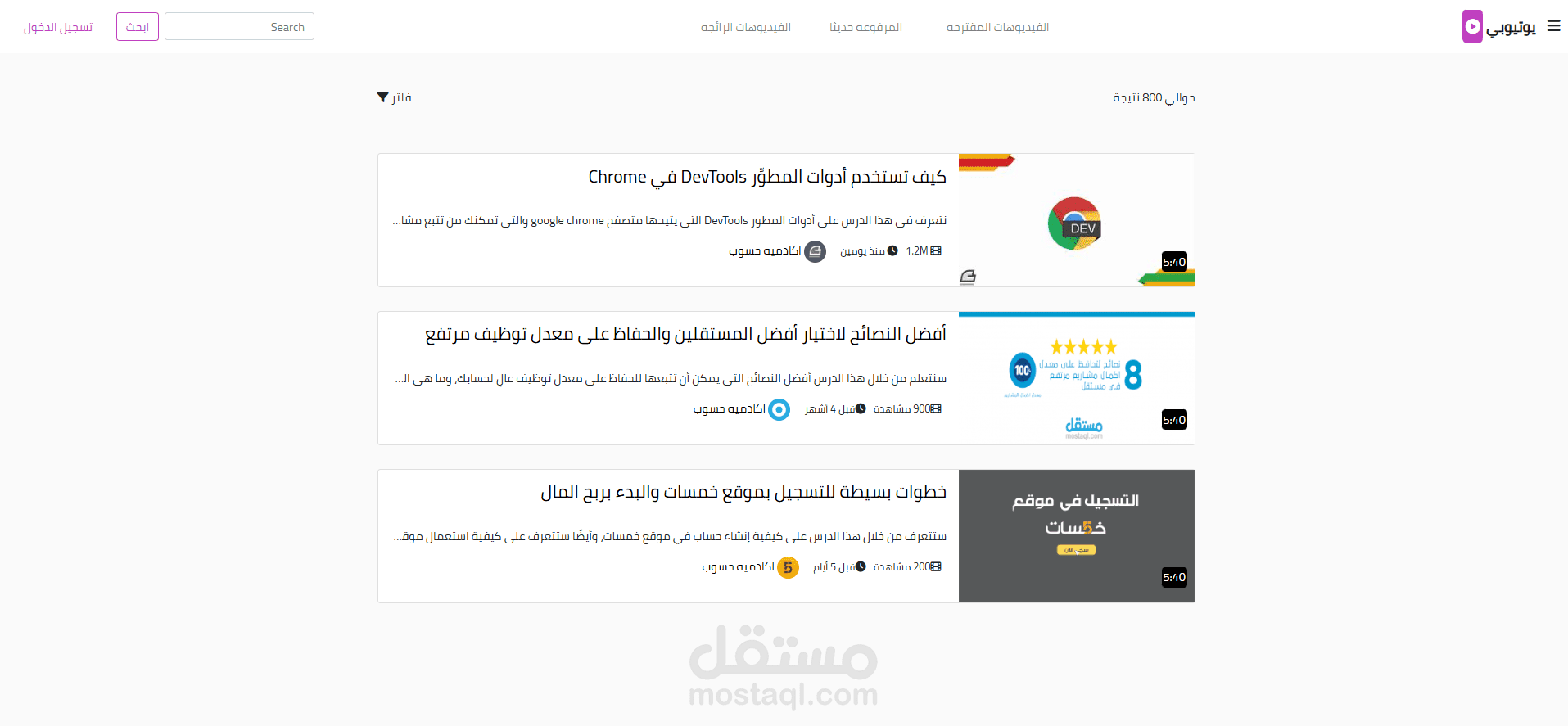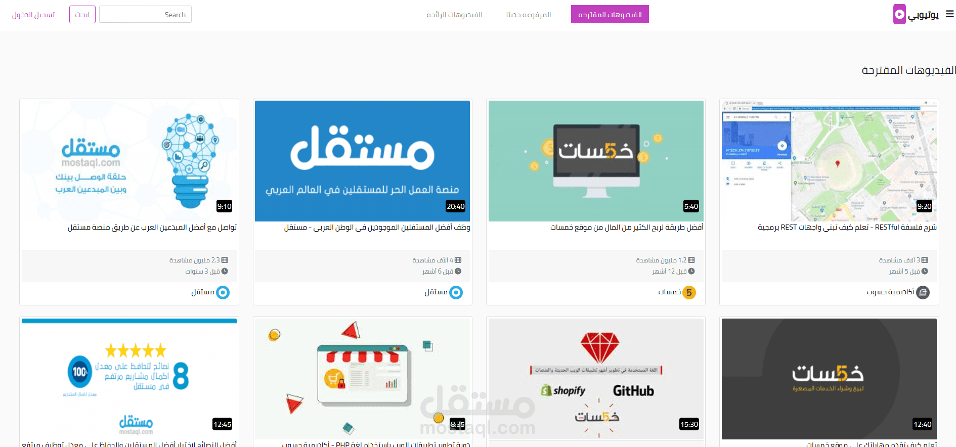 يحتوي الموقع على شريط تنقل علوي، شريط جانبي، وشبكة فيديوهات مع تفاصيل مثل الصورة والعنوان وعدد المشاهدات.