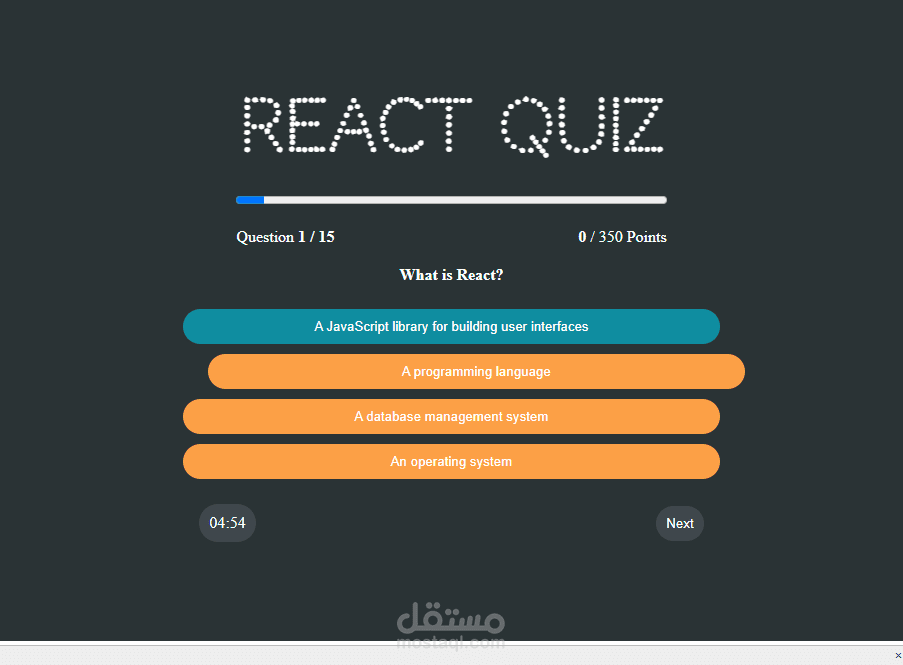 A simple quiz application built with React . It allows users to take a 15-question quiz on React concepts.