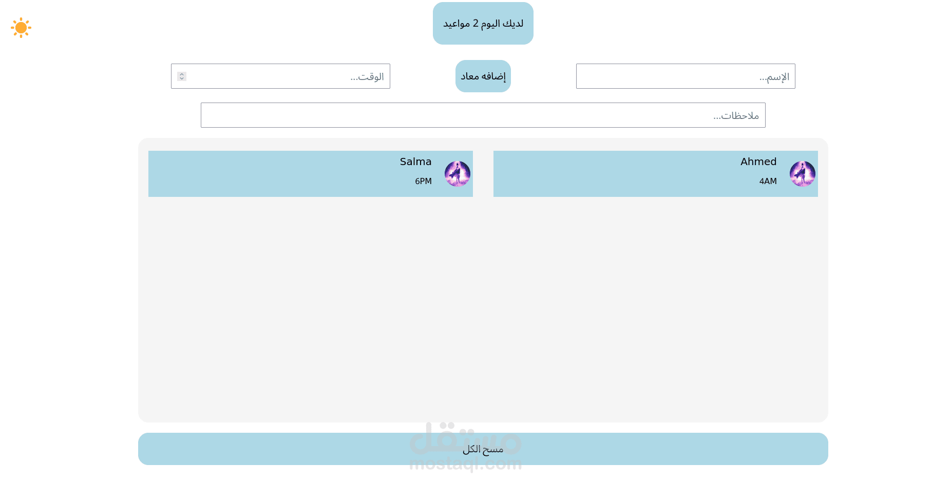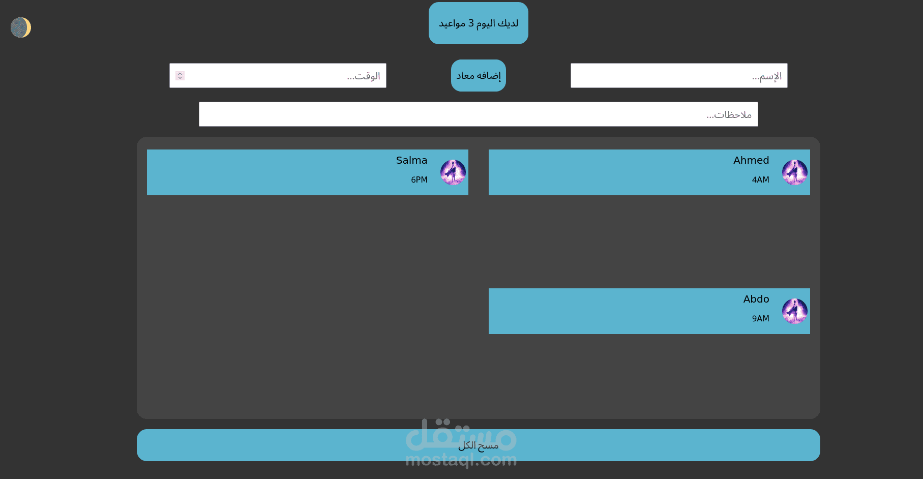 عند كتابه الاسم و المعاد فهو اجباري لعمل المعاد اما الملاحظات فهو اختياري يقوم التطبيق باخذ الاسم والمعاد في card و يتم و ضعها في grid حتي يتم عمل style و تنظيم ال card و عند الضغط عليه يقوم بعمل rotate by css لأظهار الملاحظات التي هي بالخلف