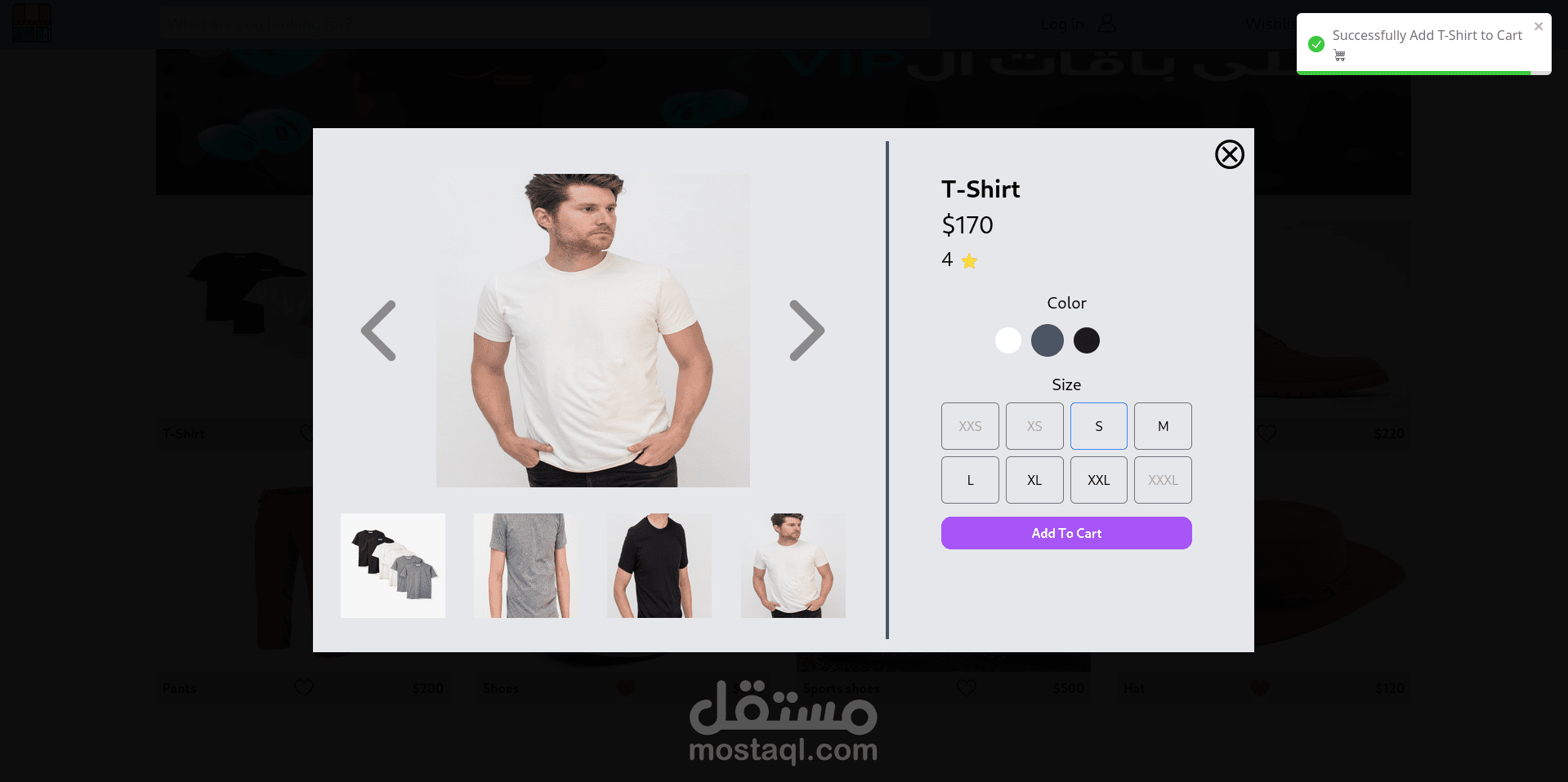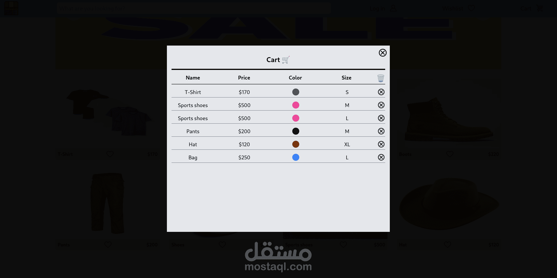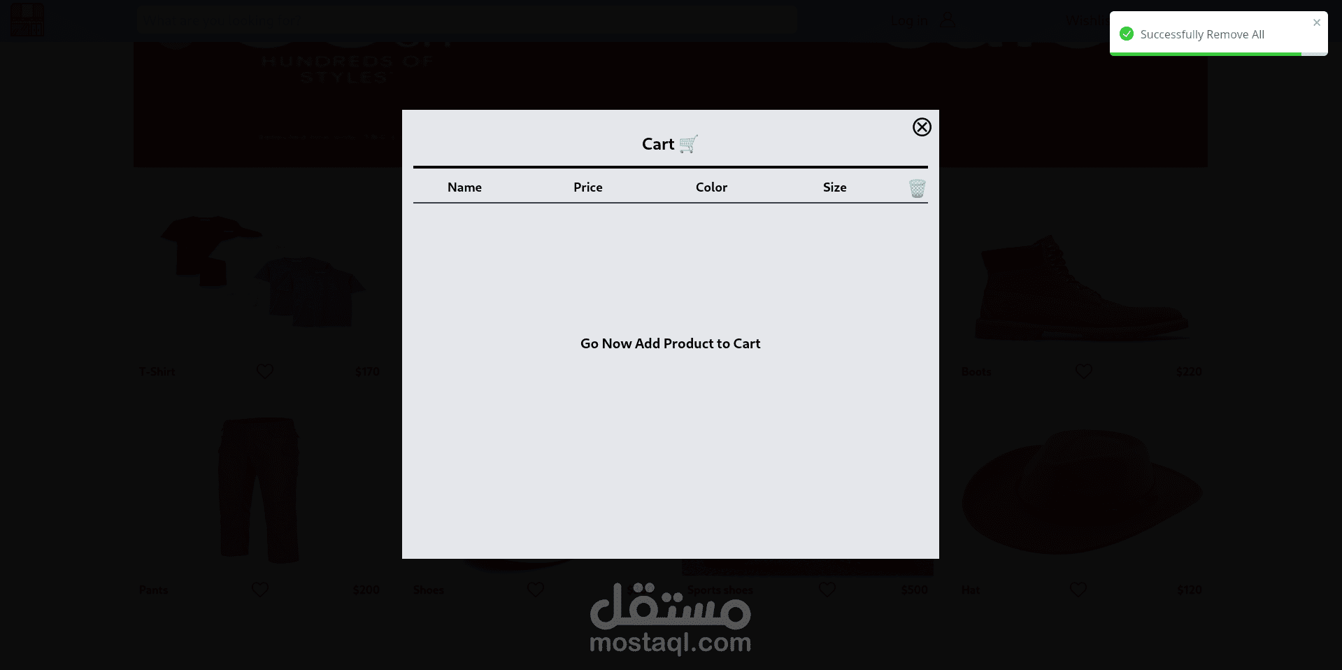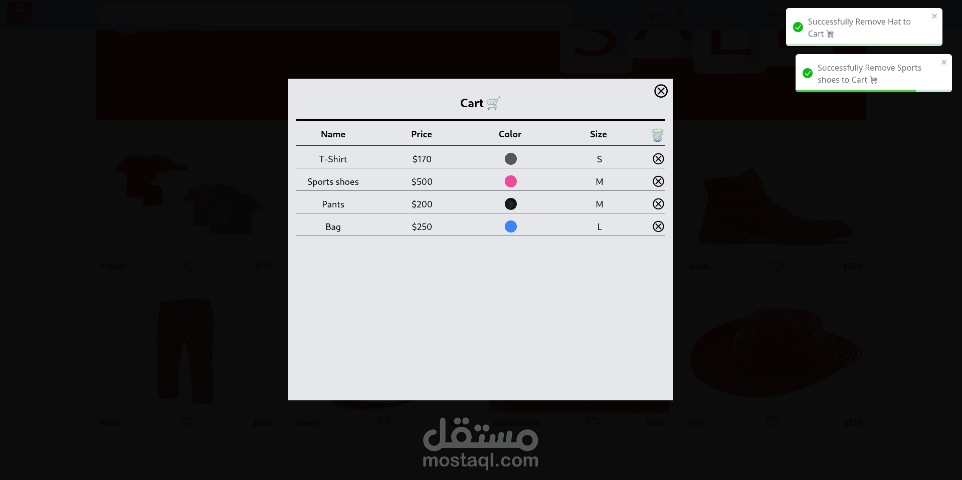 5- ويتم اضافه الي عربه التسوق عند تحديد اللون و الحجم حتي يتم اضافتها الي عربه التسوق ويمكن حذف كل عنصر علي حده ويمكن حذف الكل عن طريق الضغط علي السله يتم حذف كله useState send array [ empty ]