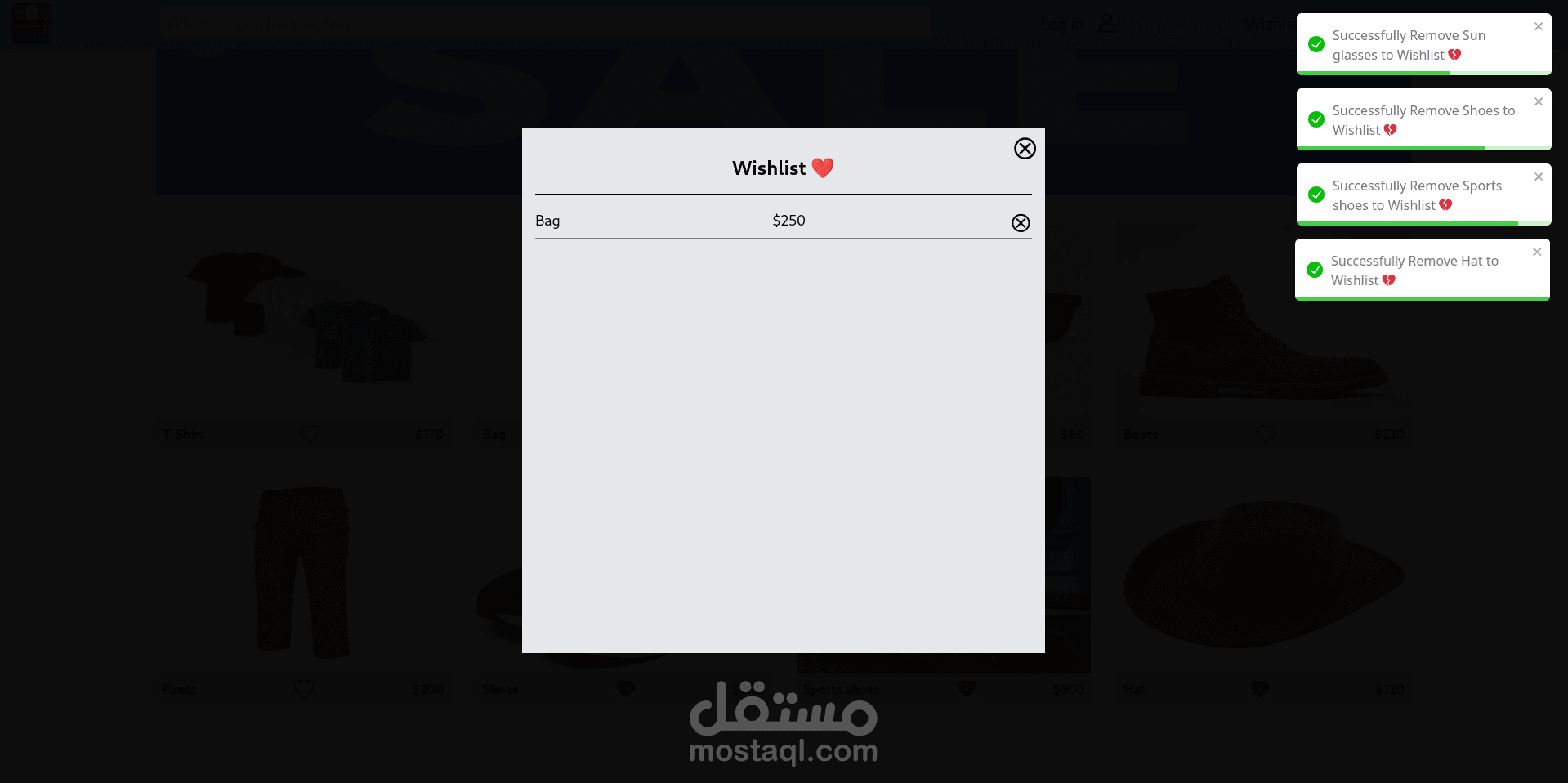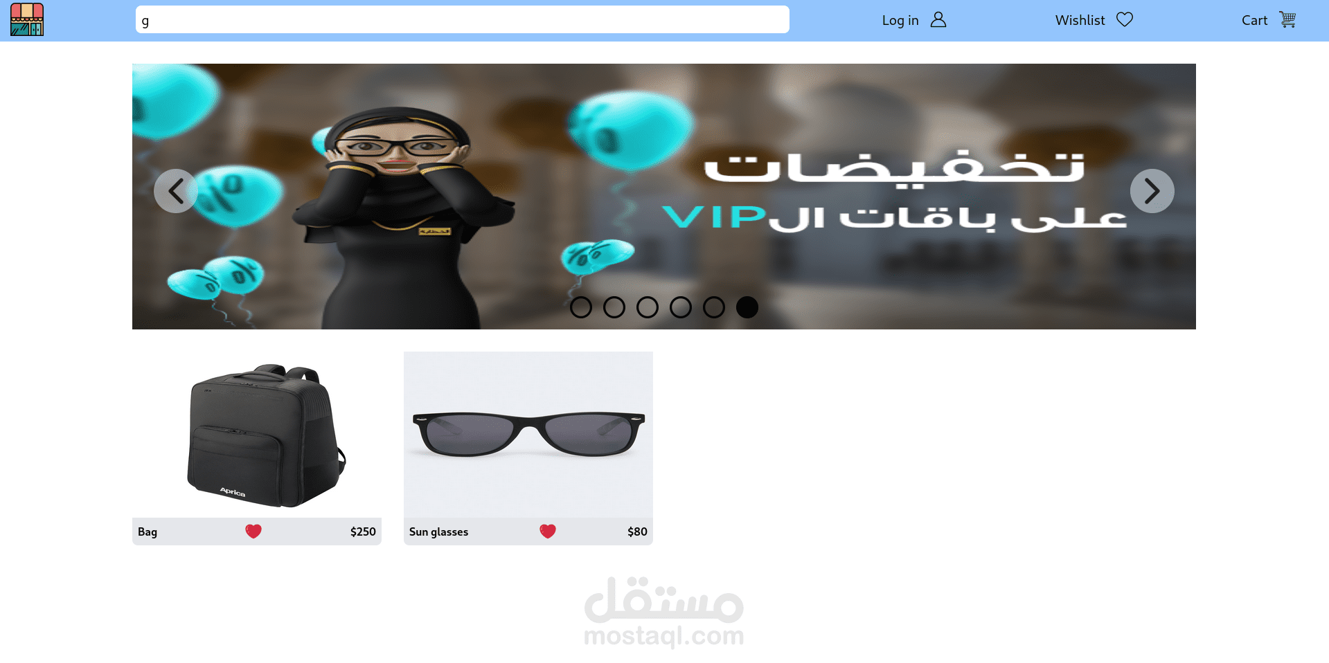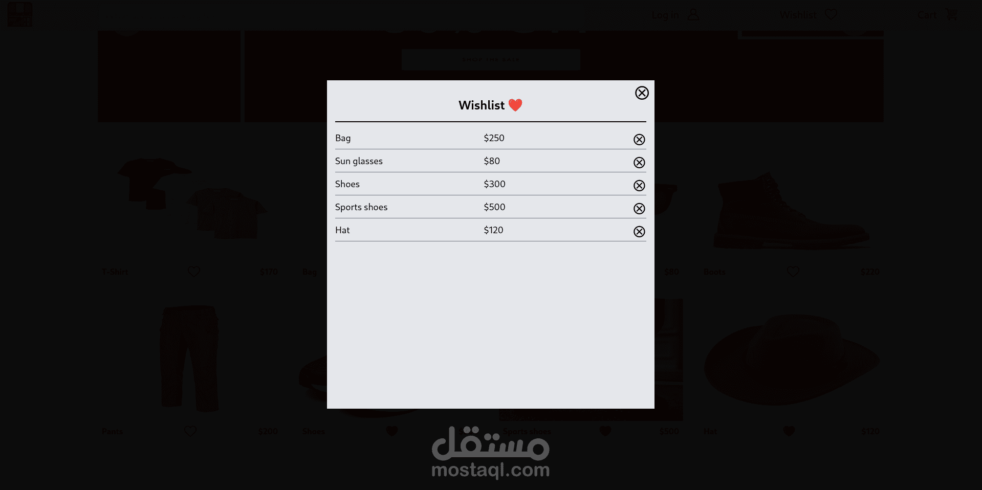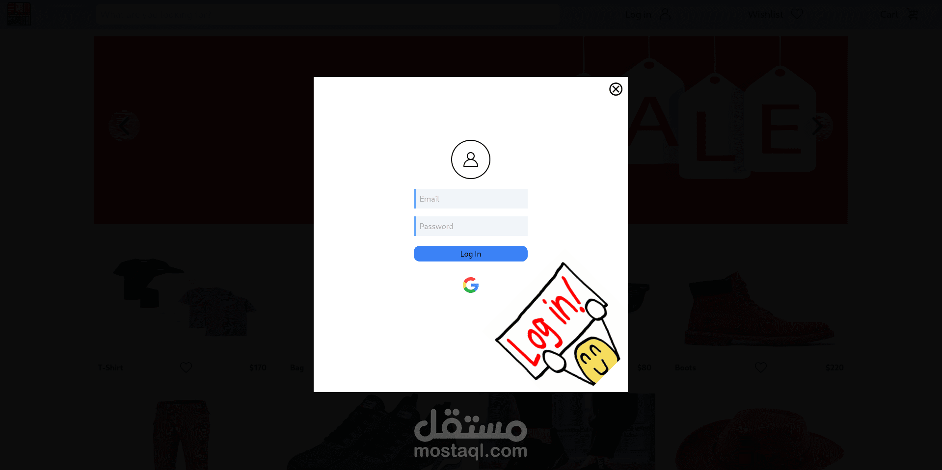 ويوجد بها log in يتم فتحها عن طريق الضغط عليها ويتم فتحها وهي و wishlist and cart and ALert جميعهم لهم نفس الطريق الا وهي useState true and false if true open if false close and value default false