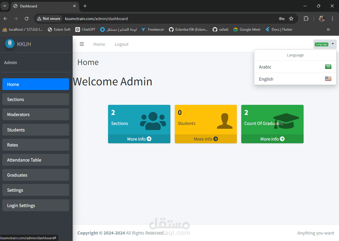 لوحة تحكم موقع تعدد اللغات لادارة مكتب تعليمي لاعطاء الكورسات