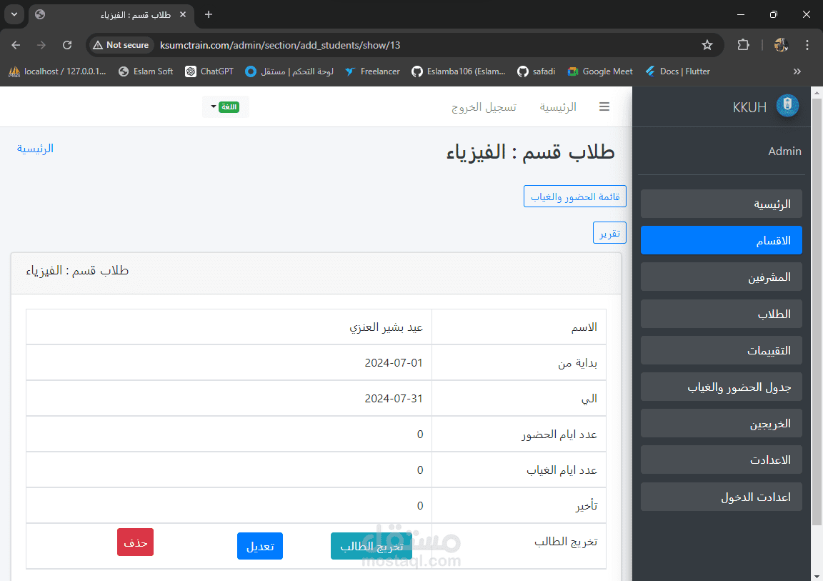 والطالب يري احصائياته وتقييماته من حضور وغياب و التقييم النهائي ومدته داخل القسم و اجازاته