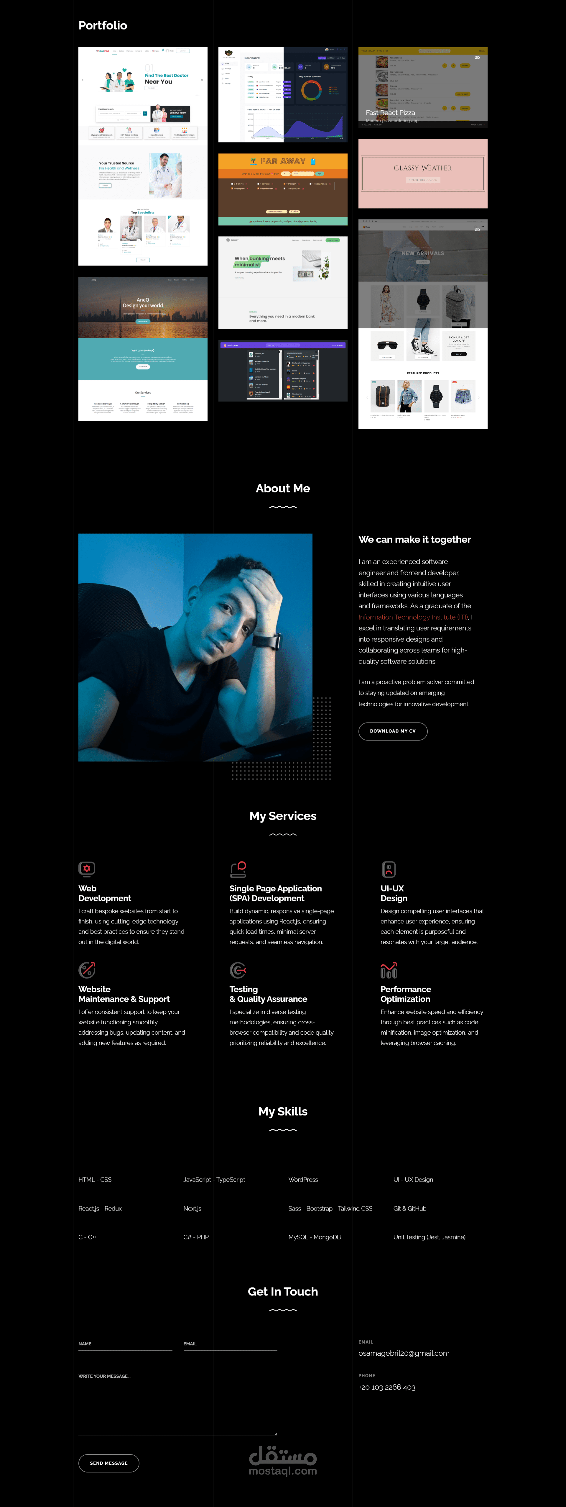 هذا هو موقع محفظتي الشخصية الذي يعرض مهاراتي وبعض مشاريعي. تم بناء الموقع باستخدام HTML، SCSS، CSS، JavaScript، وPHP لمعالجة النماذج.