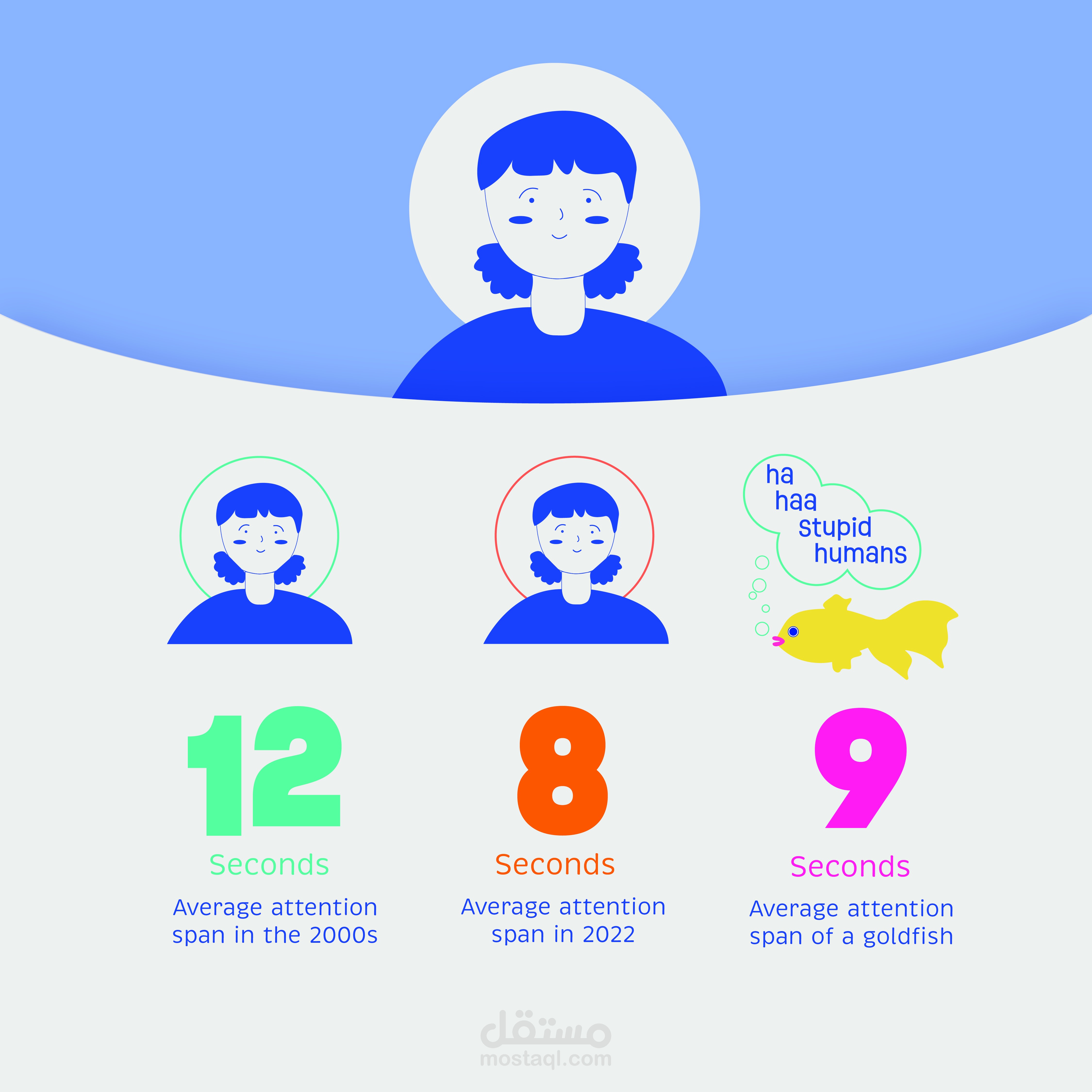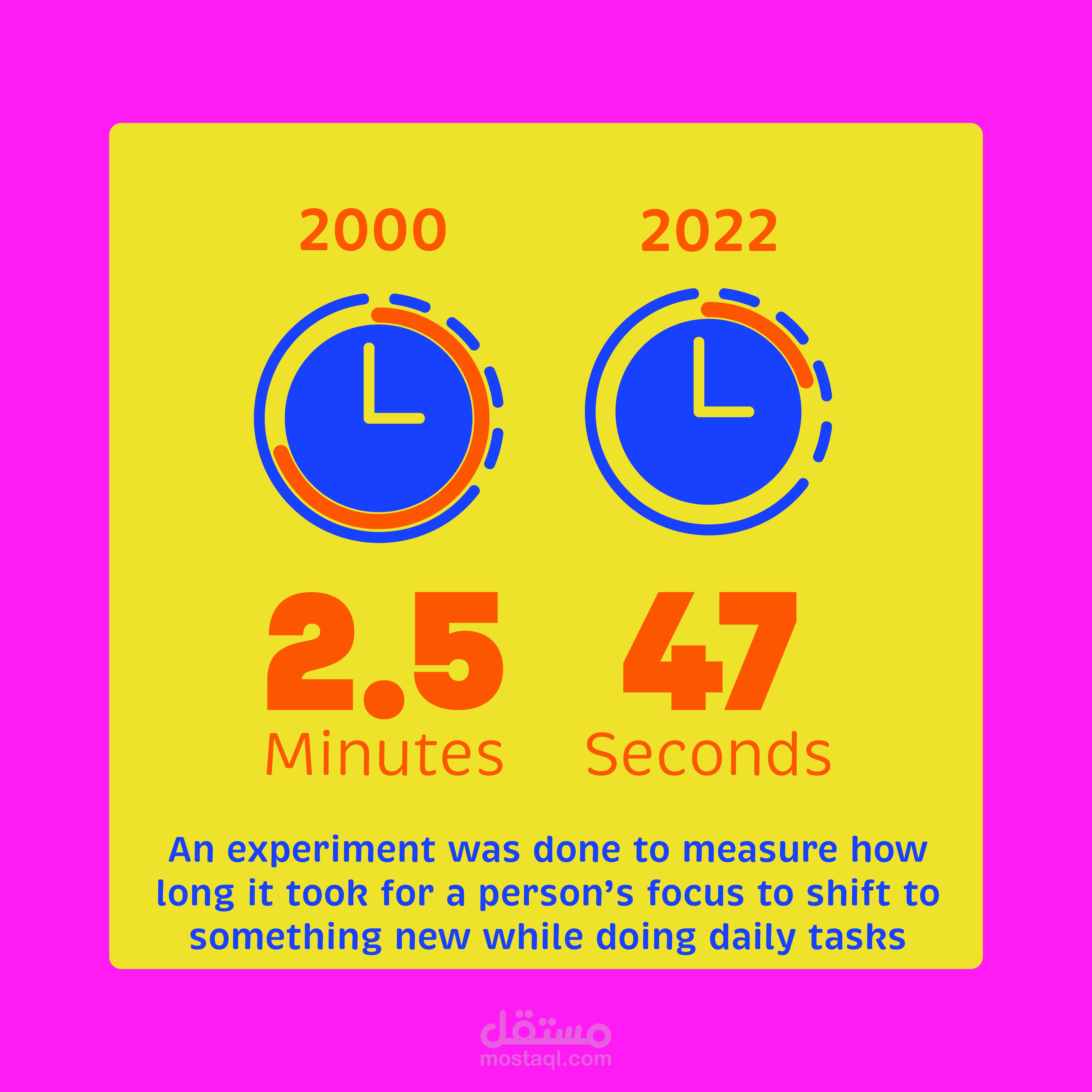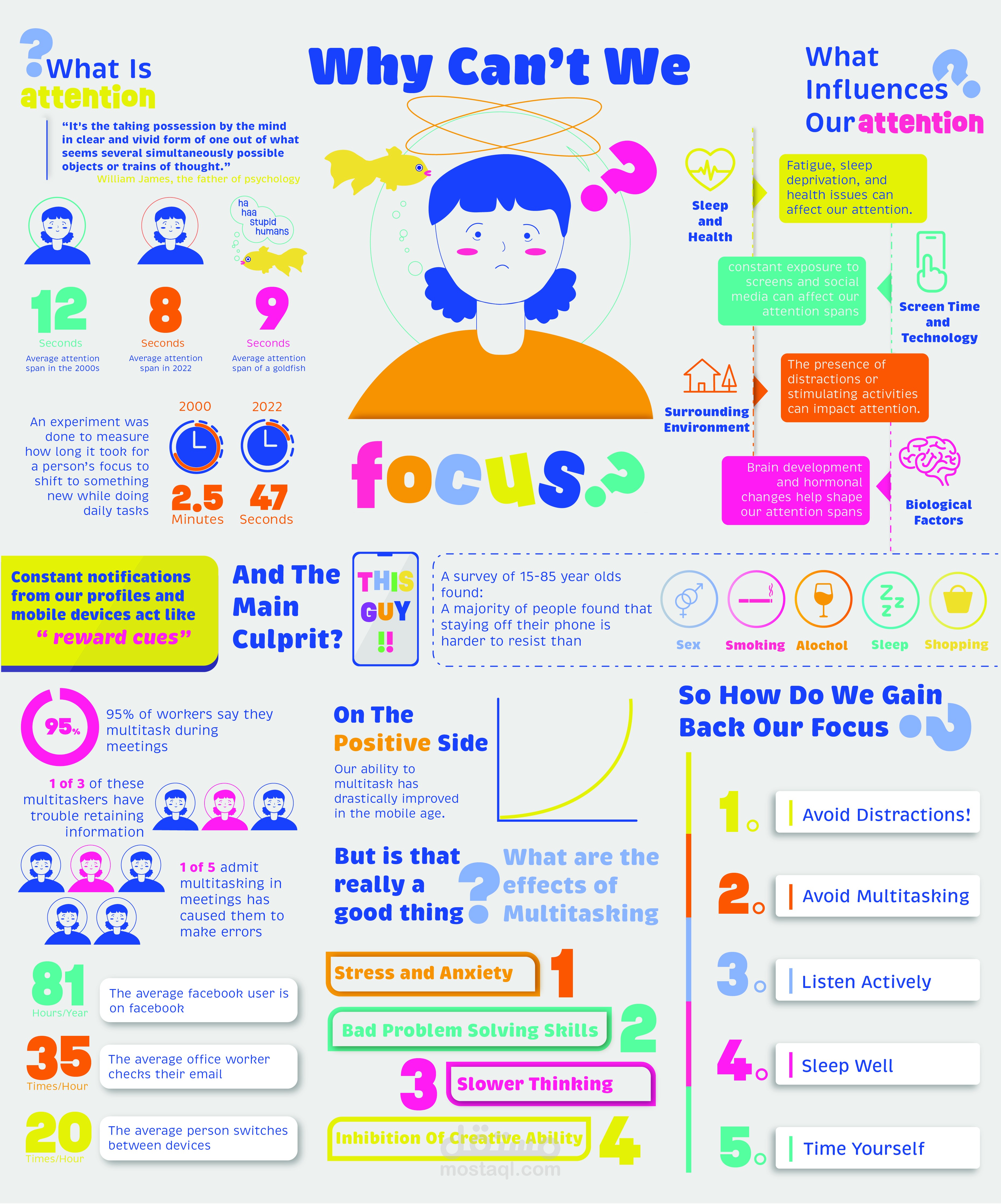 تصميم انفوجرافيك ومجموعة من منشورات السوشال ميديا الملخصة حول موضوع نقص التركيز وارتباطه بنمط حياتنا المتسارع واستعمالنا للإنترنت والأجهزة الإلكترونية