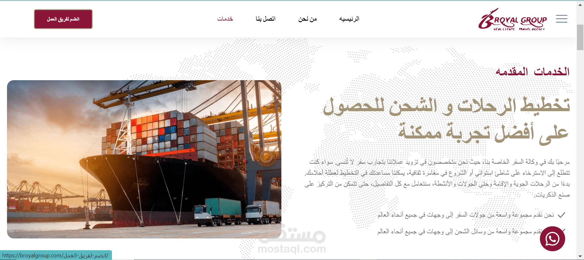 موقع "برويال جروب" هو منصة إلكترونية تعرض خدمات ومشاريع شركة برويال جروب. الشركة متخصصة في تقديم حلول متكاملة في مجالات متعددة الشحن و خدمات السفر. من خلال الموقع، يمكن للزوار استكشاف المشاريع السابقة والحالية للشركة، والتعرف على الخدمات المقدمة، والتواصل مع فريق الشركة للحصول على مزيد من المعلومات أو طلب استشارات مخصصة. يتميز الموقع بتصميم أنيق واحترافي يعكس هوية الشركة ويوفر تجربة مستخدم سلسة وسهلة التنقل.