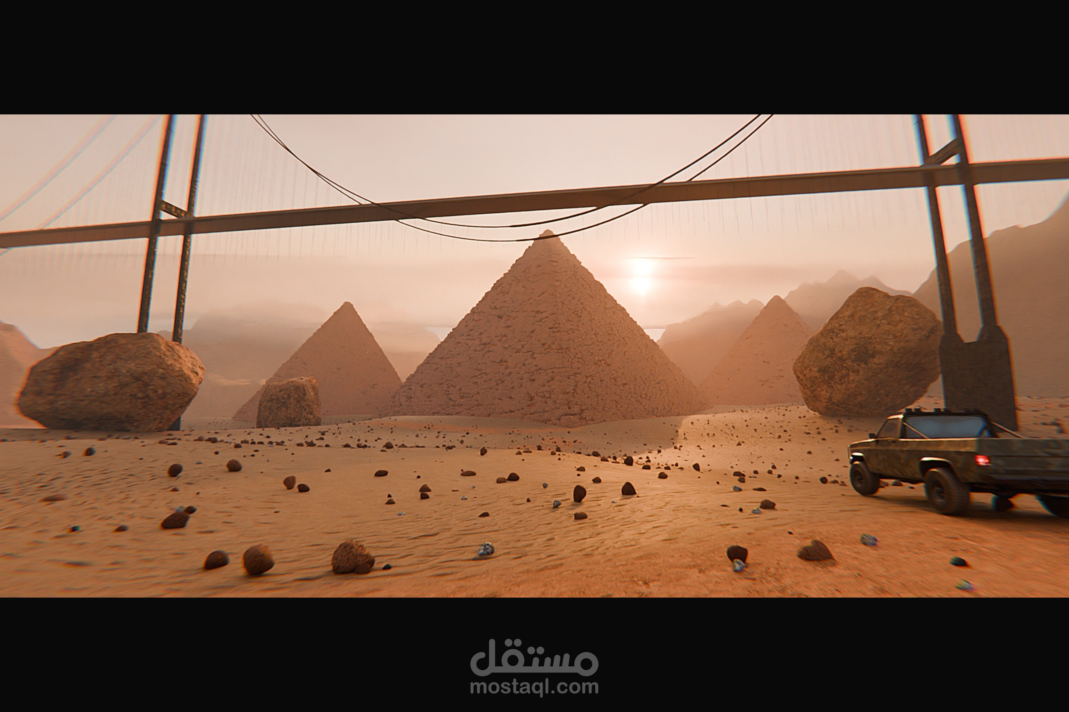 تصميم بيئه للعبة تحتوي علي الاهرامات مع جبال وكوبري وصخور مع سيارة مع مشهد سنمائي