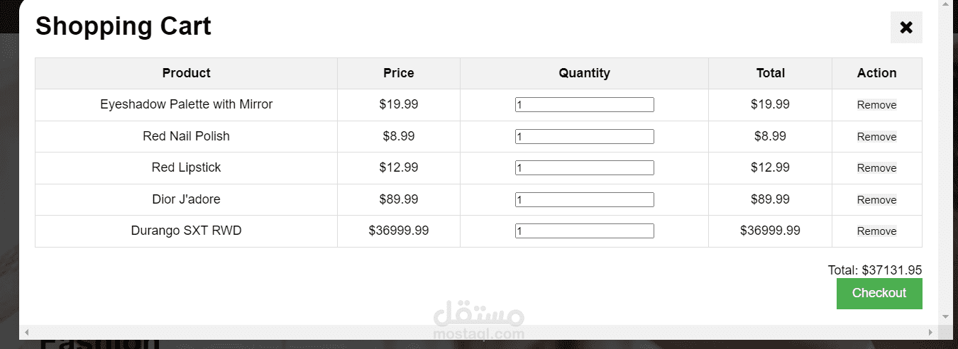 سلة تسوق تفاعلية تتيح إضافة وحذف المنتجات.