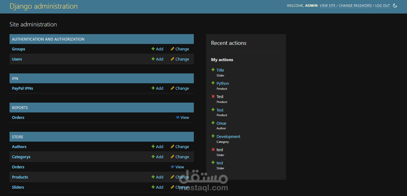 Control Panel: There’s an administration page (possibly built with Django’s built-in admin interface) for managing books, orders, and other store-related data.