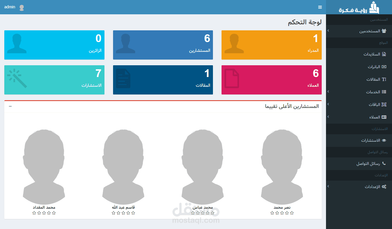 موقع يحتوي على جسابات مستخدمين من 3 انواع (مدير موقع - مستشار - زائر) ولغتين (العربية والانكليزية) كما يحتوي على مقالات واستشارات وتعليقات بالاضافة للصفحات التعريفية ونظام تقييم للمستشارين وشات وقائمة بريدية ومحرك بحث مع فلاتر