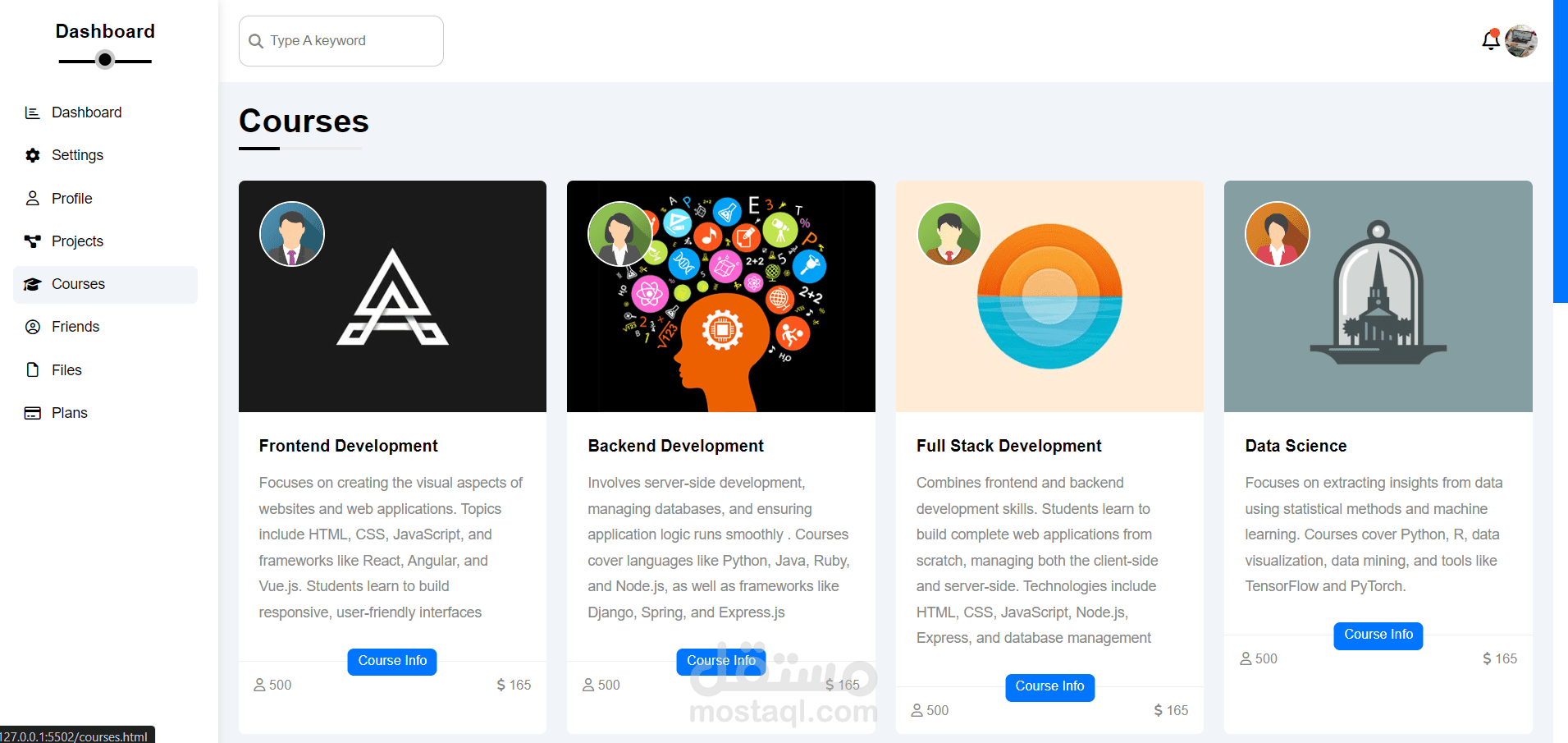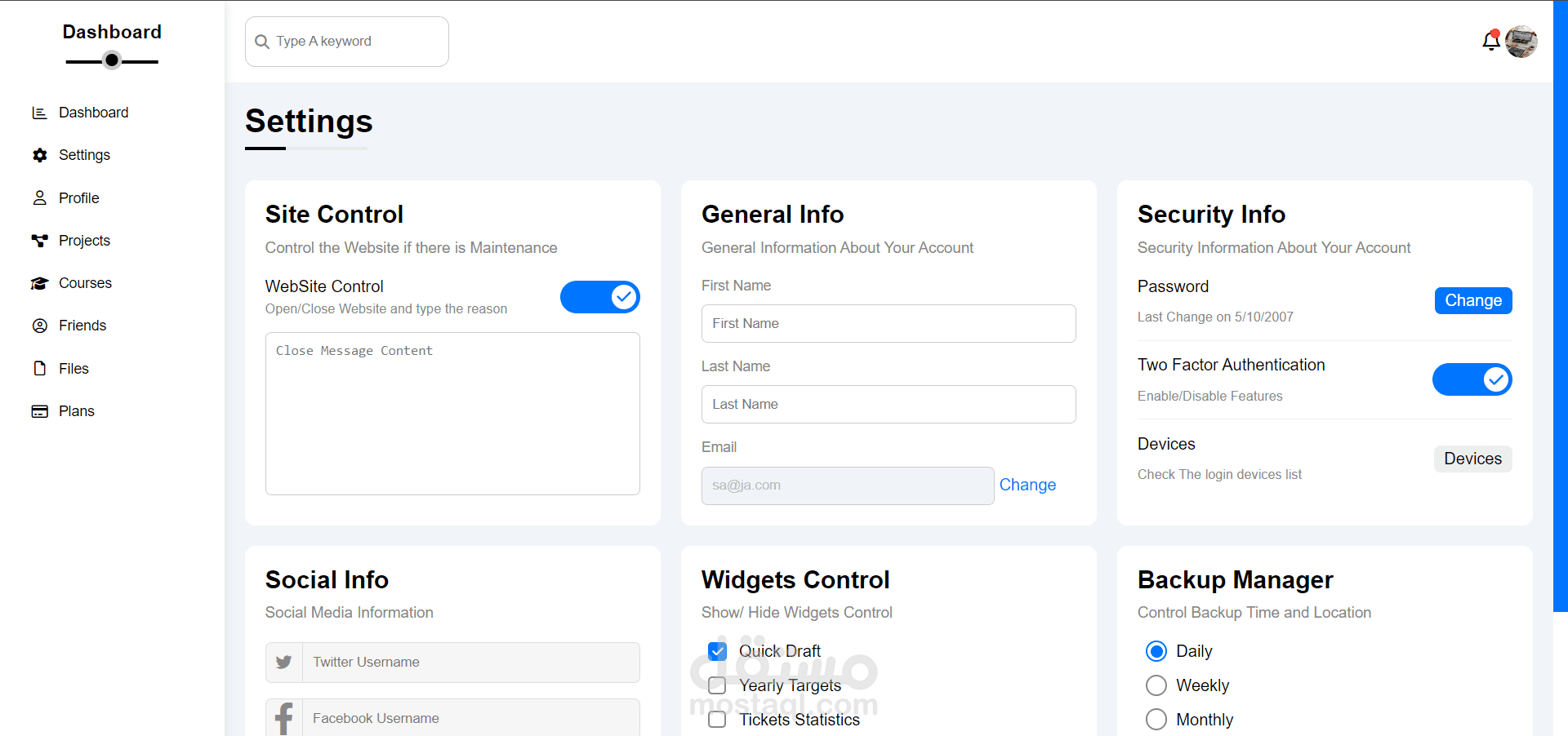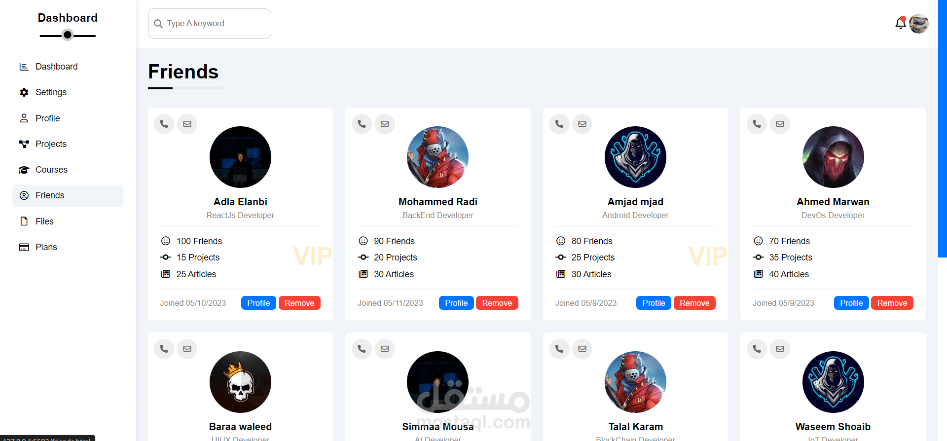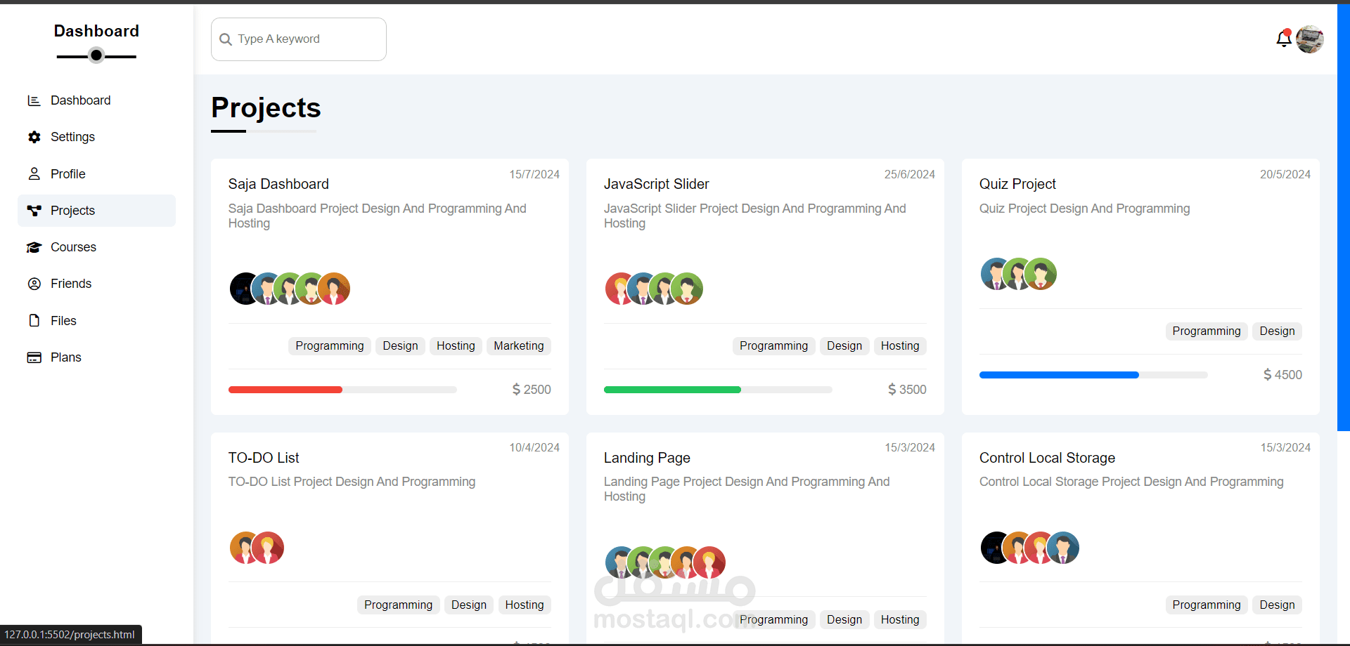 Dashboard، Settings، Profile، Projects، Courses، Friends، Files، Plans.