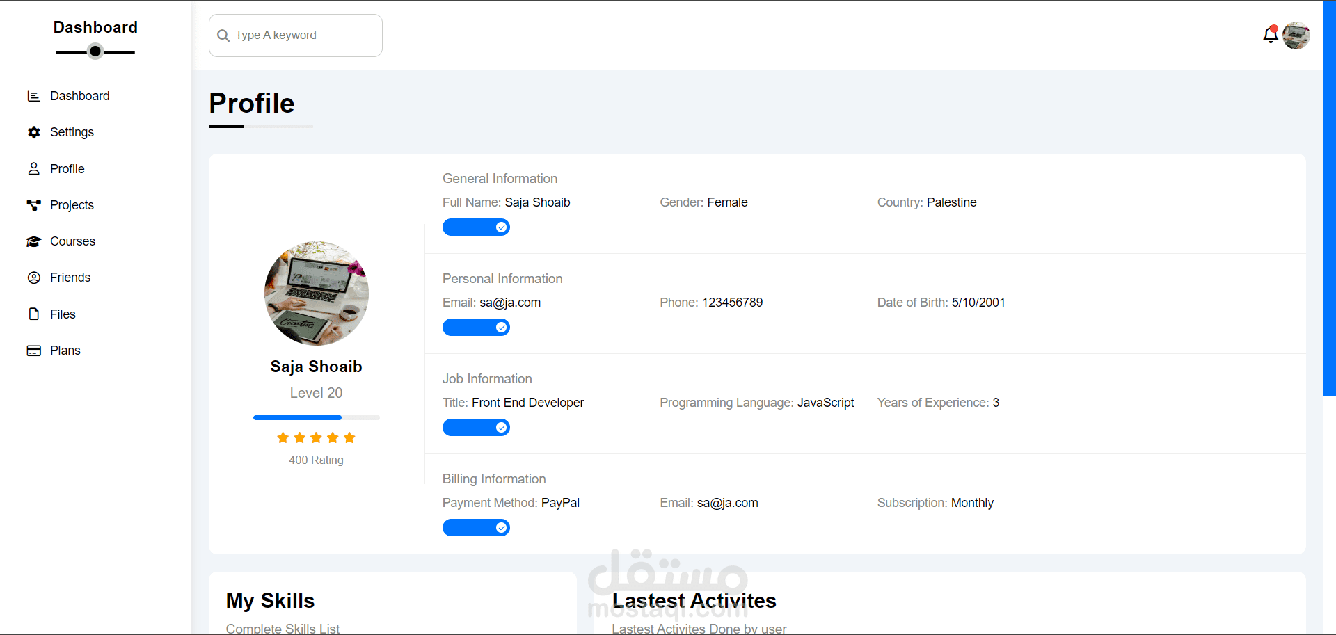 3- الملف الشخصي (Profile): يتضمن المهارات الخاصة بي، أحدث الأنشطة.