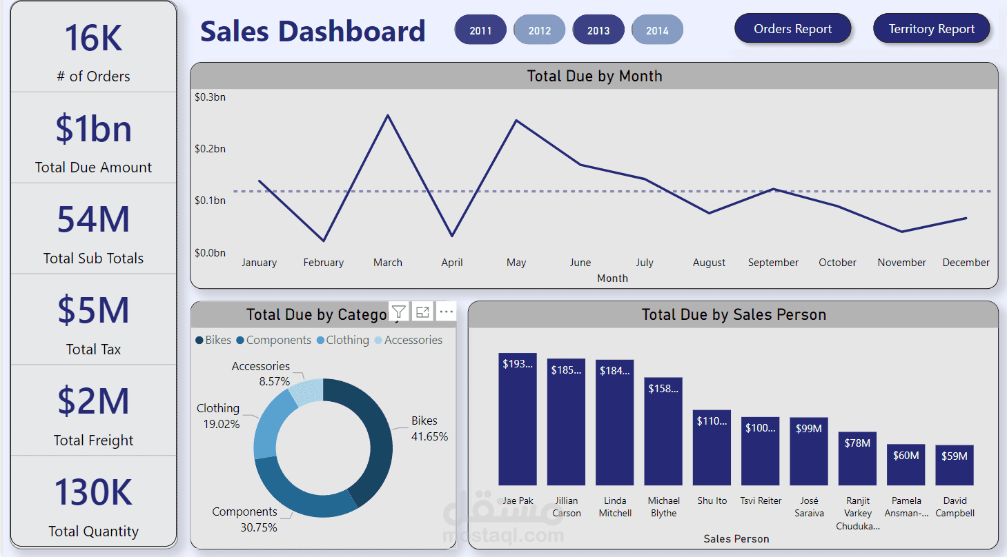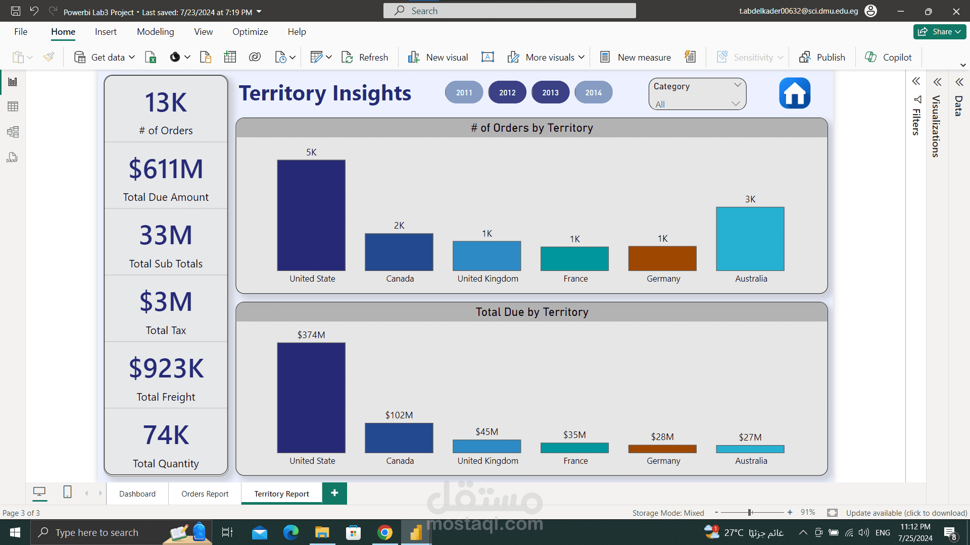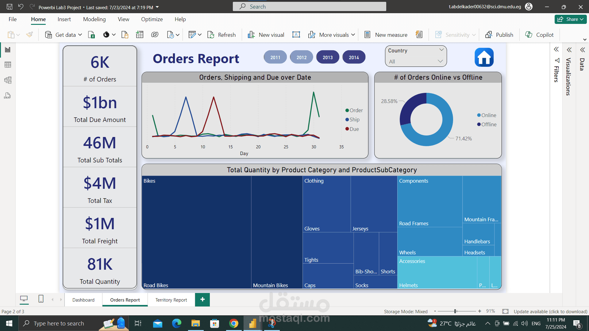 قمنا بتصور مؤشرات الأداء الرئيسية (KPIs) ومقاييس مثل عدد الطلبات، والإجمالي الفرعي، والإجمالي المستحق، وإجمالي الضرائب، وإجمالي الشحن، وإجمالي الكميات المباعة.