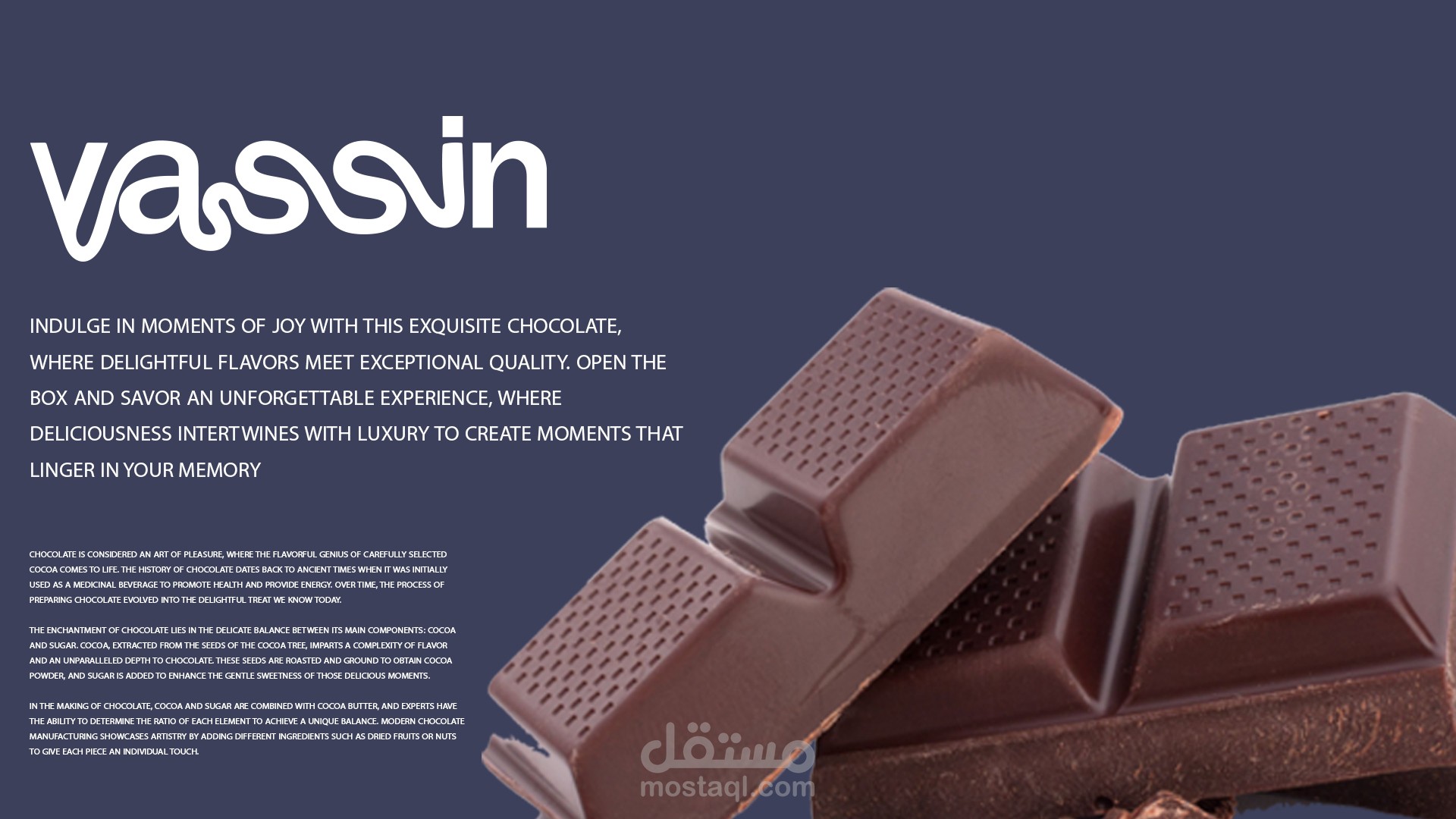 Vassin هو مصنع شوكولاتة فاخر يقدم مجموعة متنوعة من الشوكولاتة المصنوعة من أجود أنواع الكاكاو والمكونات الطبيعية. يهدف المشروع إلى تقديم تجربة شوكولاتة فريدة من نوعها تجمع بين الطعم الفاخر والجودة العالية، مع التركيز على الابتكار والتنوع في النكهات.