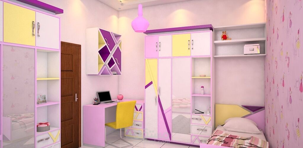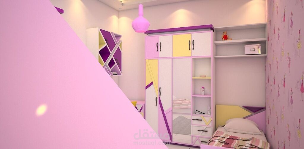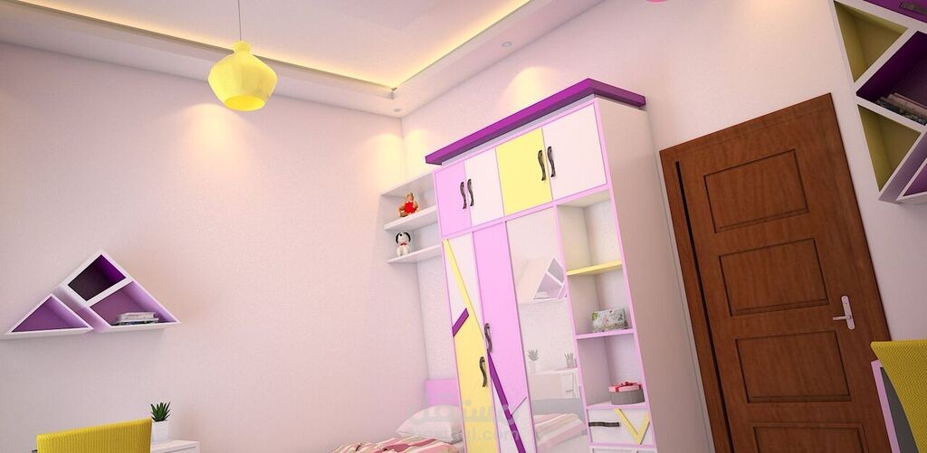 The room was designed for two sisters in an apartment and the size of the room was taken into sizes of furniture in addition to using the colors according to the choice of the sisters