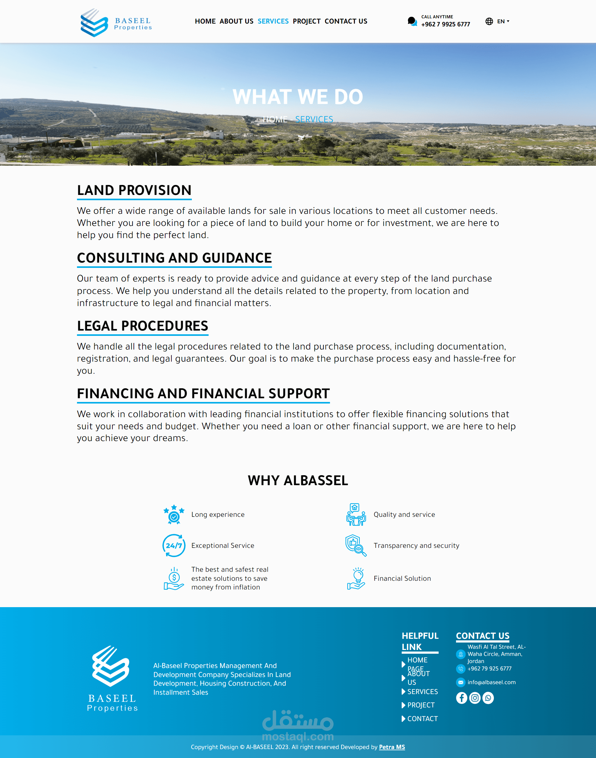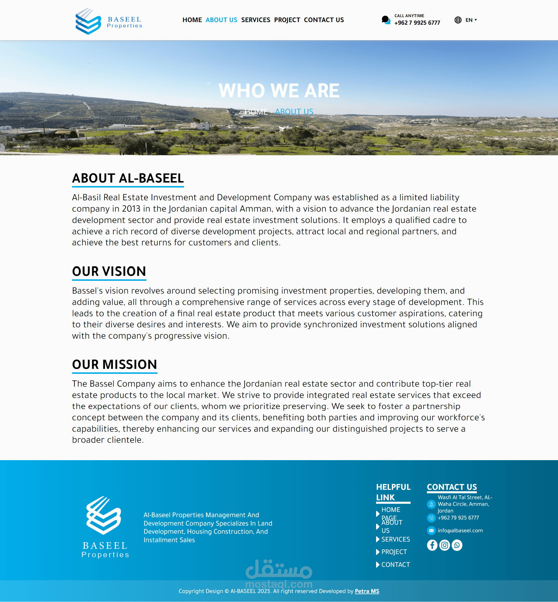 Al-Basil Real Estate Investment and Development Company was established as a limited liability company in 2013 in the Jordanian capital Amman, with a vision to advance the Jordanian real estate development sector and provide real estate investment solutions. It employs a qualified cadre to achieve a rich record of diverse development projects, attract local and regional partners, and achieve the best returns for customers and clients.