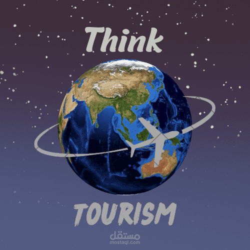 في الوسط، صورة كوكب الأرض مع طائرة تدور حوله، مما يرمز إلى السفر والسياحة العالمية.