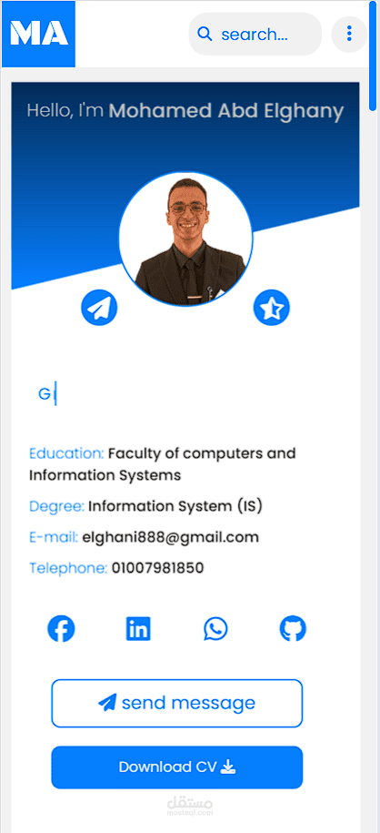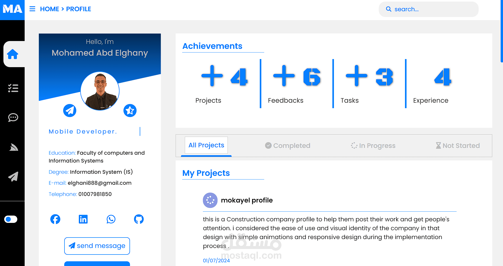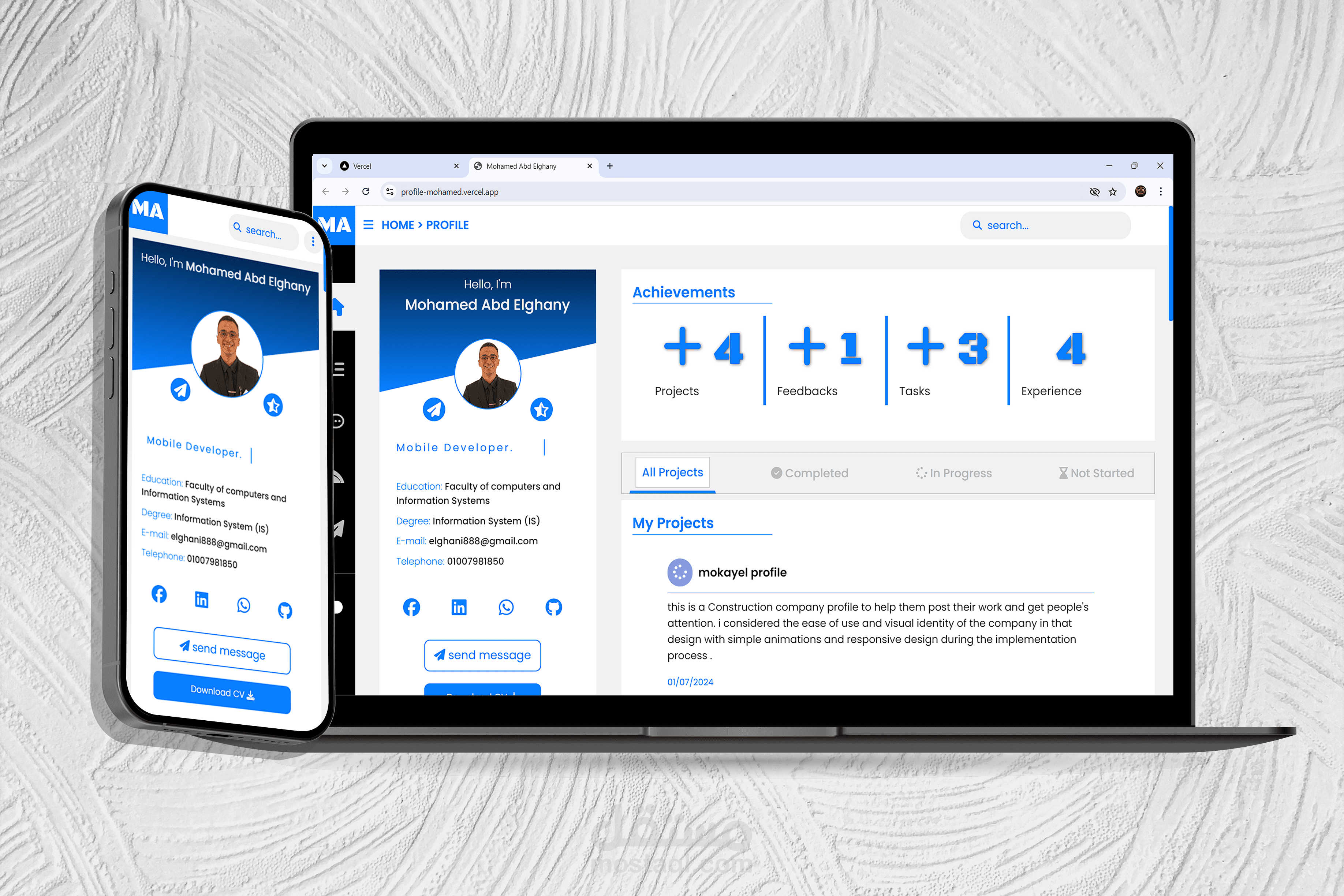 الهدف من هذا العمل هو تصميم موقع لعرض الاعمال والخبرات الشخصية لى كمبرمج مع مراعاه ان يكون الموقعع تفاعليا مع المستخدم وحفظ بيانات المستخدمين فى قاعده البيانات مع انشاء لوحة للادمن للتحكم فى المشاريع التى يتم عرضها والصور واتاحه التواصل مع المستخدمين