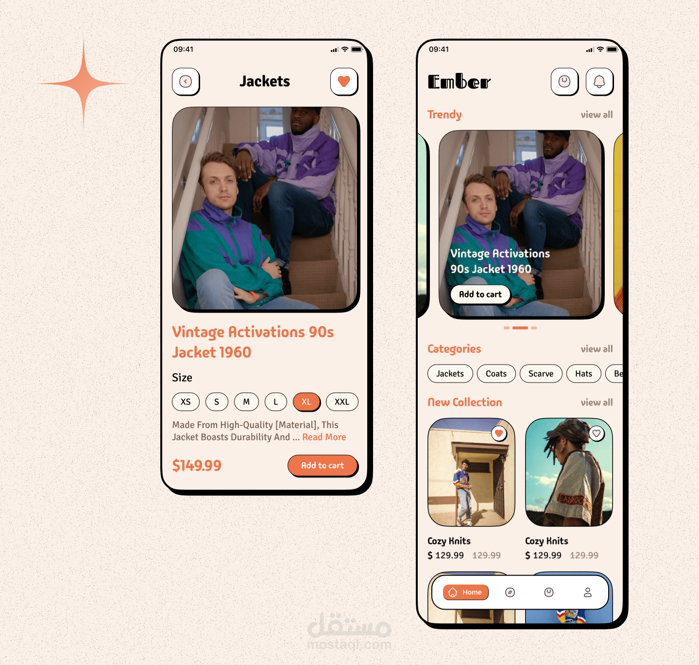 لقد قمت بتصميم هذا التطبيق لشركة "Ember"، وهي علامة تجارية مختصة في بيع الأزياء. يهدف التطبيق إلى تقديم تجربة تسوق سلسة وجذابة للمستخدمين، مع التركيز على عرض المنتجات بوضوح وسهولة الوصول إلى التصنيفات المختلفة مثل السترات والمعاطف والأوشحة. يتيح التطبيق للمستخدمين استكشاف المجموعات الجديدة، وإضافة المنتجات إلى سلة التسوق بسهولة. التصميم يتميز بتنسيق أنيق وألوان مريحة، مما يعزز من تجربة التسوق العامة.
