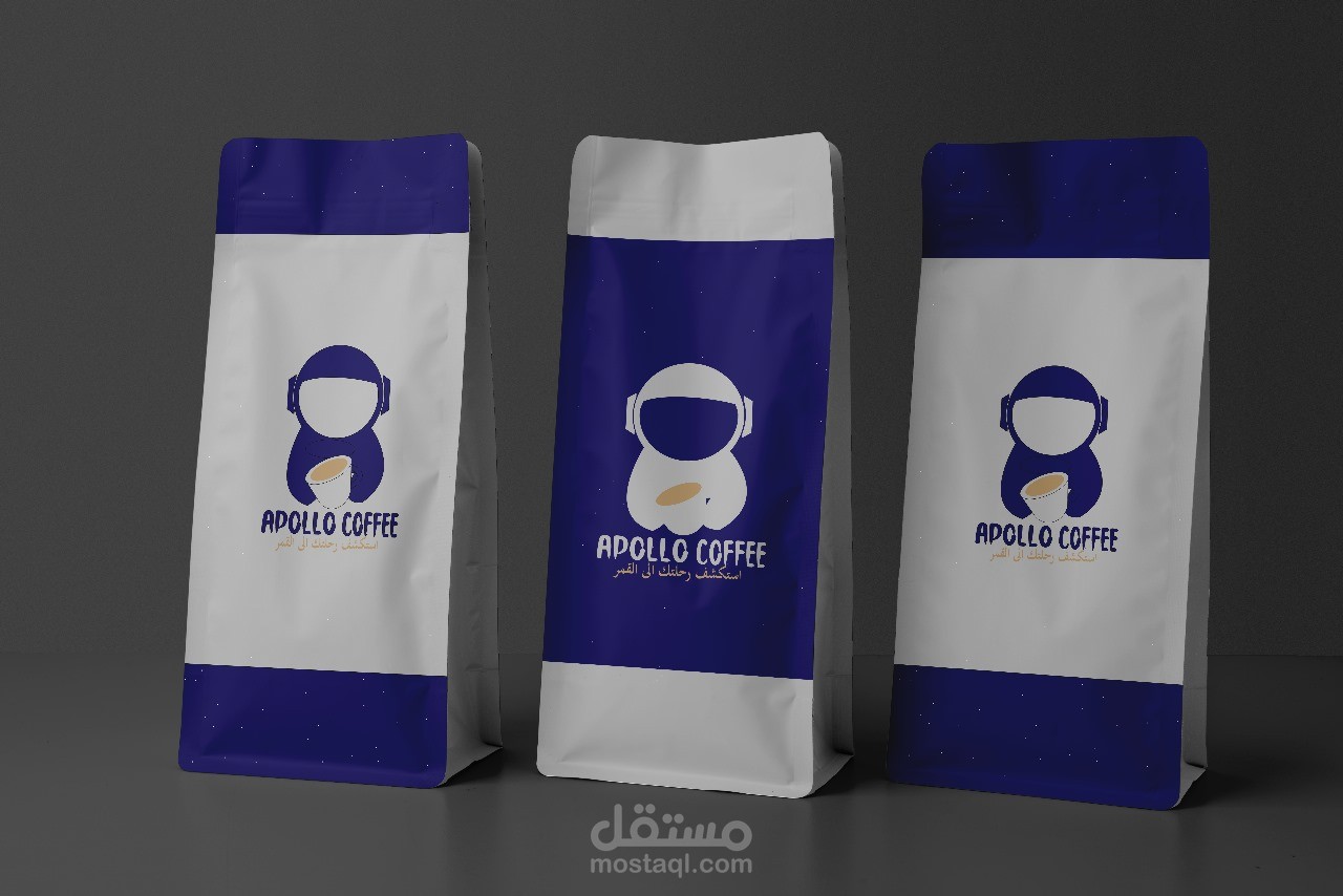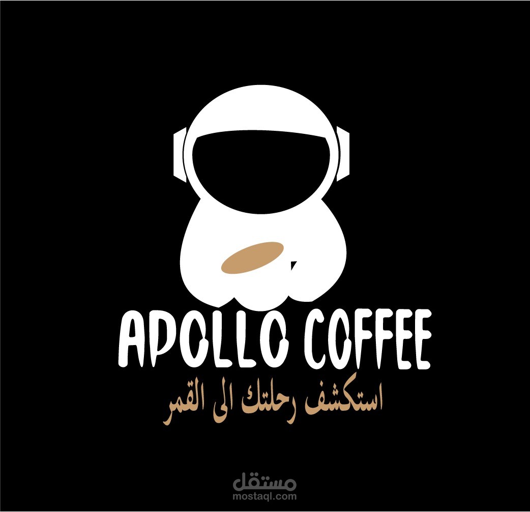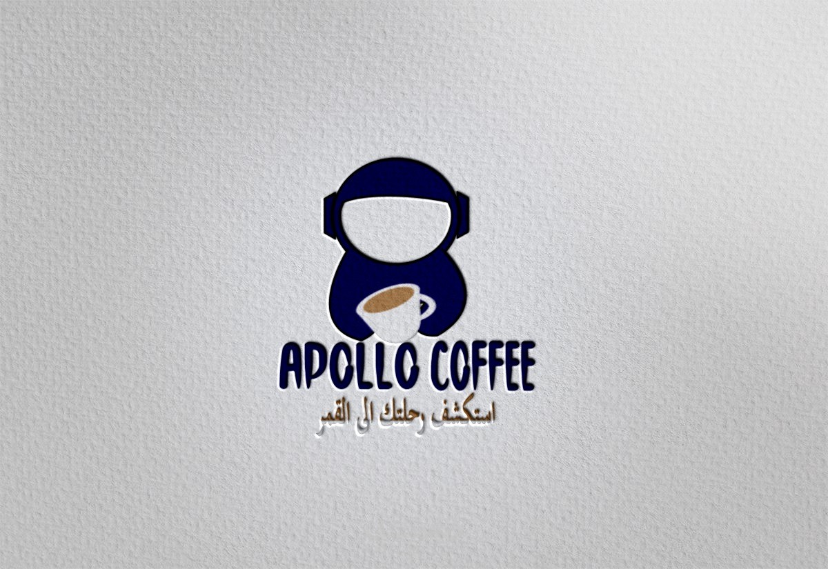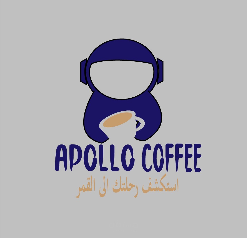 هذا العمل هو لمنتج قهوة اسمه "apollo" استلهم صاحب المنتج الاسم من اول رحلة الى القمر وأراد تجسيد الفكرة في اللوجو فاستخدمت رائد الفضاء كصورة ايقون للشعار وكتبت اسم المنتج بخط يلائم الفكرة اما الالوان فاستخدمت الأزرق الداكن والرمادي وهي الوان الفضاء ورائد الفضاء