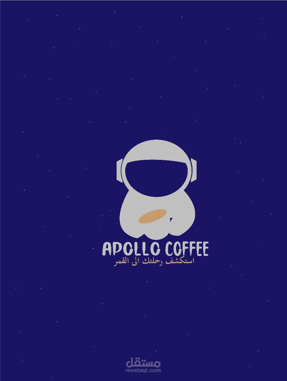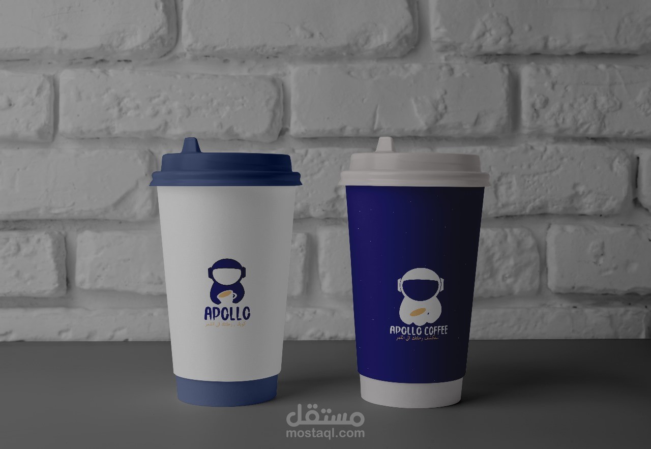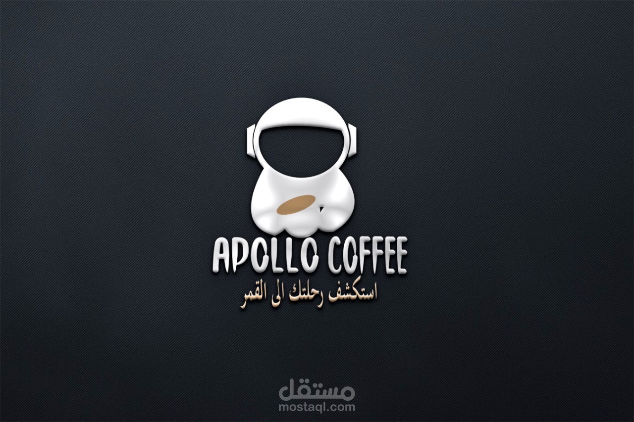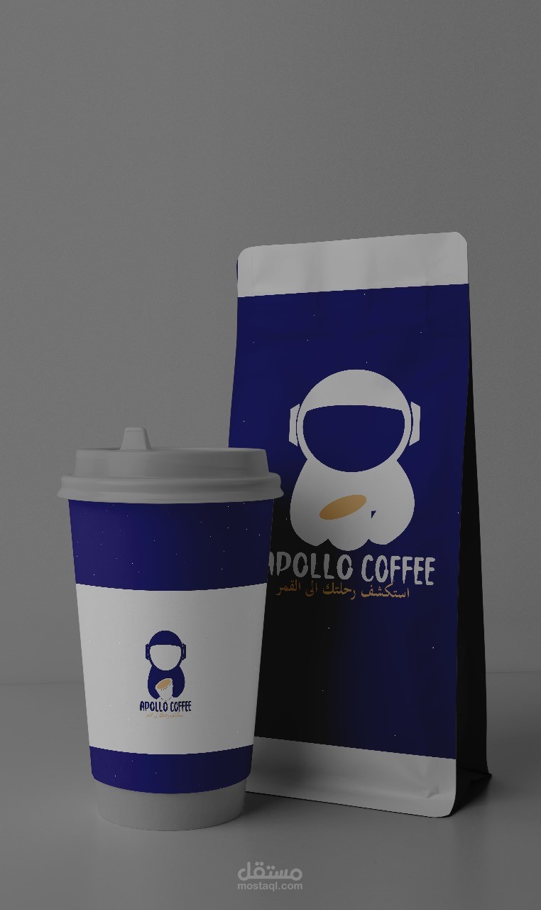هذا العمل هو لمنتج قهوة اسمه "apollo" استلهم صاحب المنتج الاسم من اول رحلة الى القمر وأراد تجسيد الفكرة في اللوجو فاستخدمت رائد الفضاء كصورة ايقون للشعار وكتبت اسم المنتج بخط يلائم الفكرة اما الالوان فاستخدمت الأزرق الداكن والرمادي وهي الوان الفضاء ورائد الفضاء