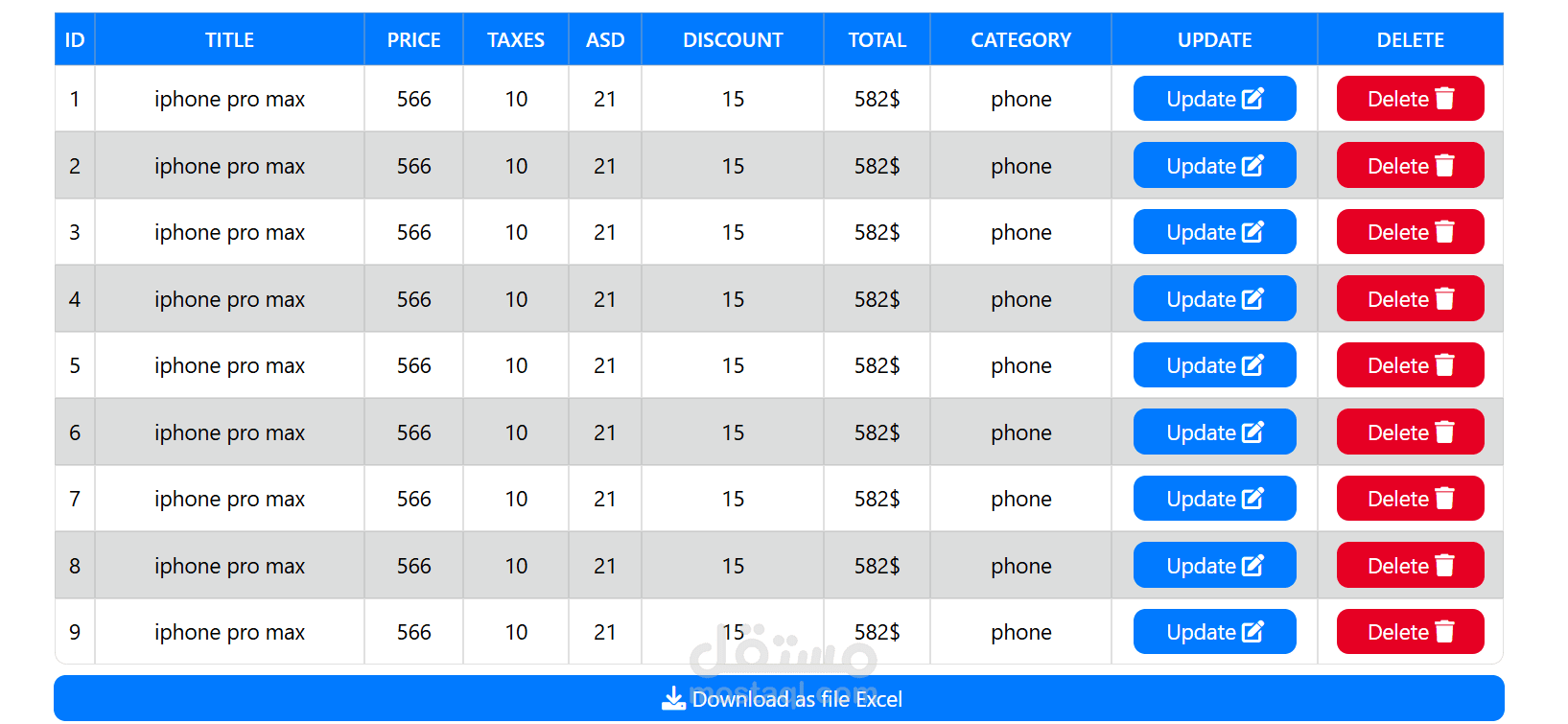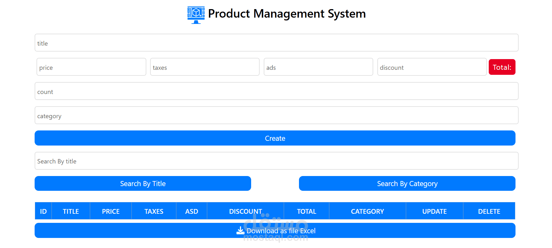 This is a simple product management system. You can add more than 100 or 1000 products with one click. You can download the table as an Excel sheet file. You can edit the product data and delete the product or delete all products with one click. You can search using the product name or category. I used HTML, CSS, JavaScript, and a very simple and eye-catching design.