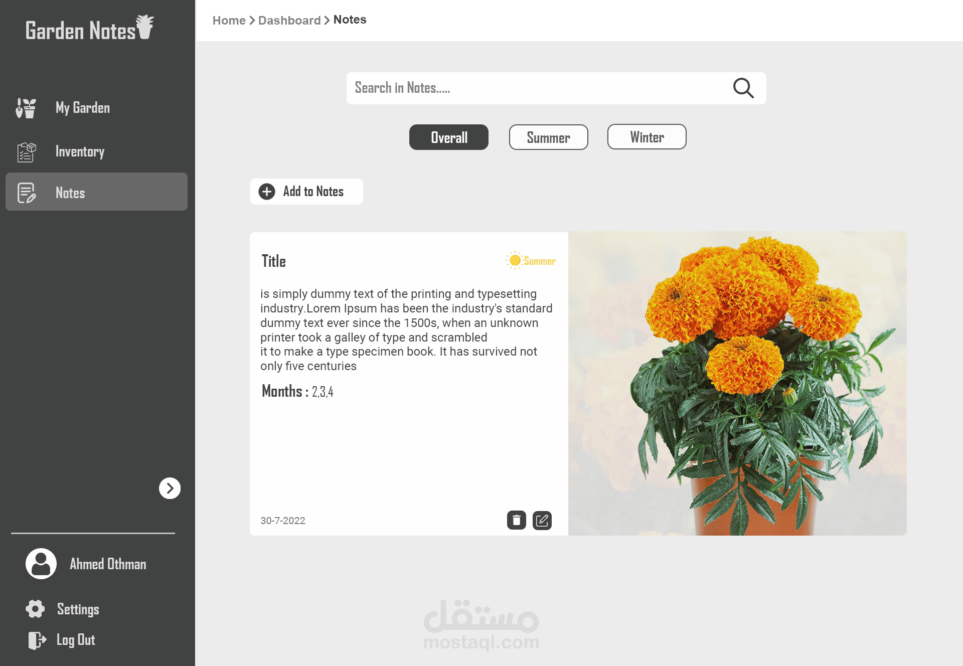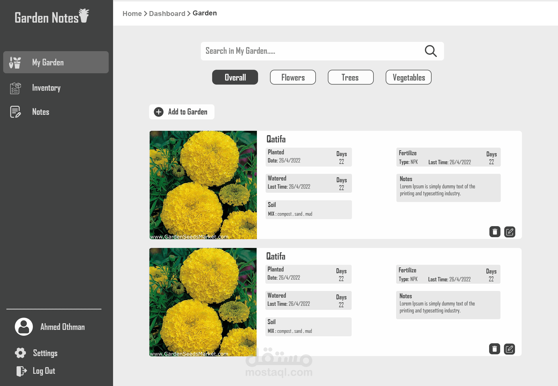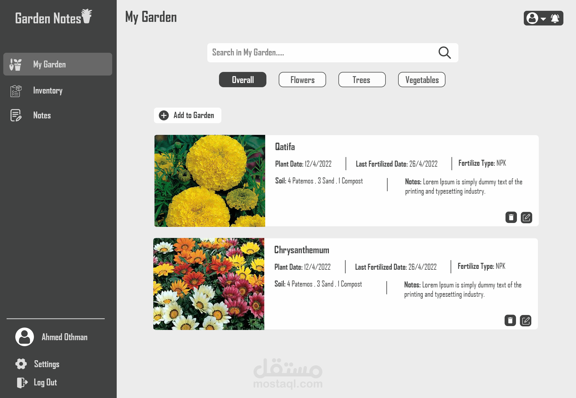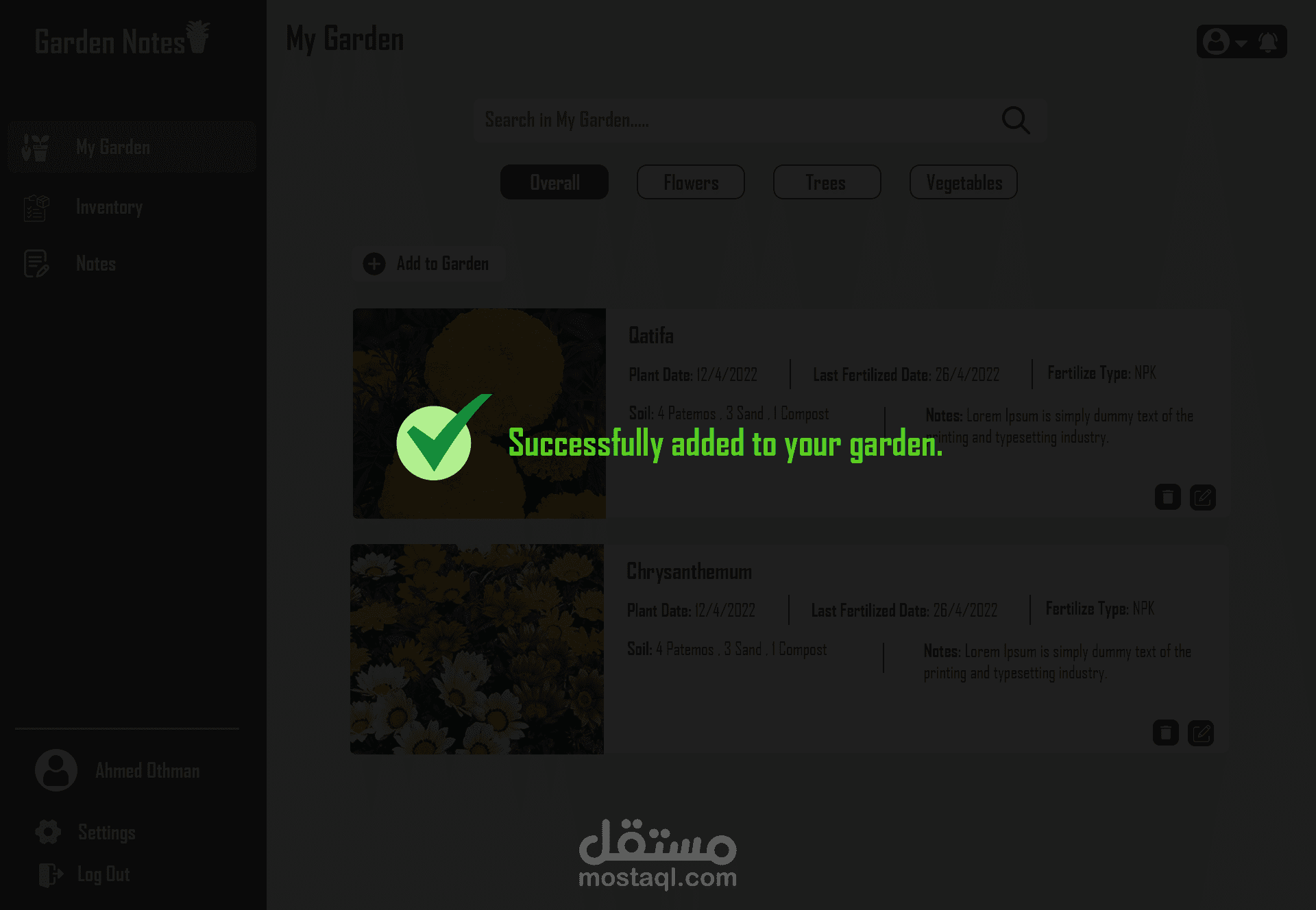 أنشئ ونظم ملاحظات لكل نبات بسهولة. قم بتضمين المعلومات الأساسية مثل نوع النبات، الصنف، والموقع في حديقتك.