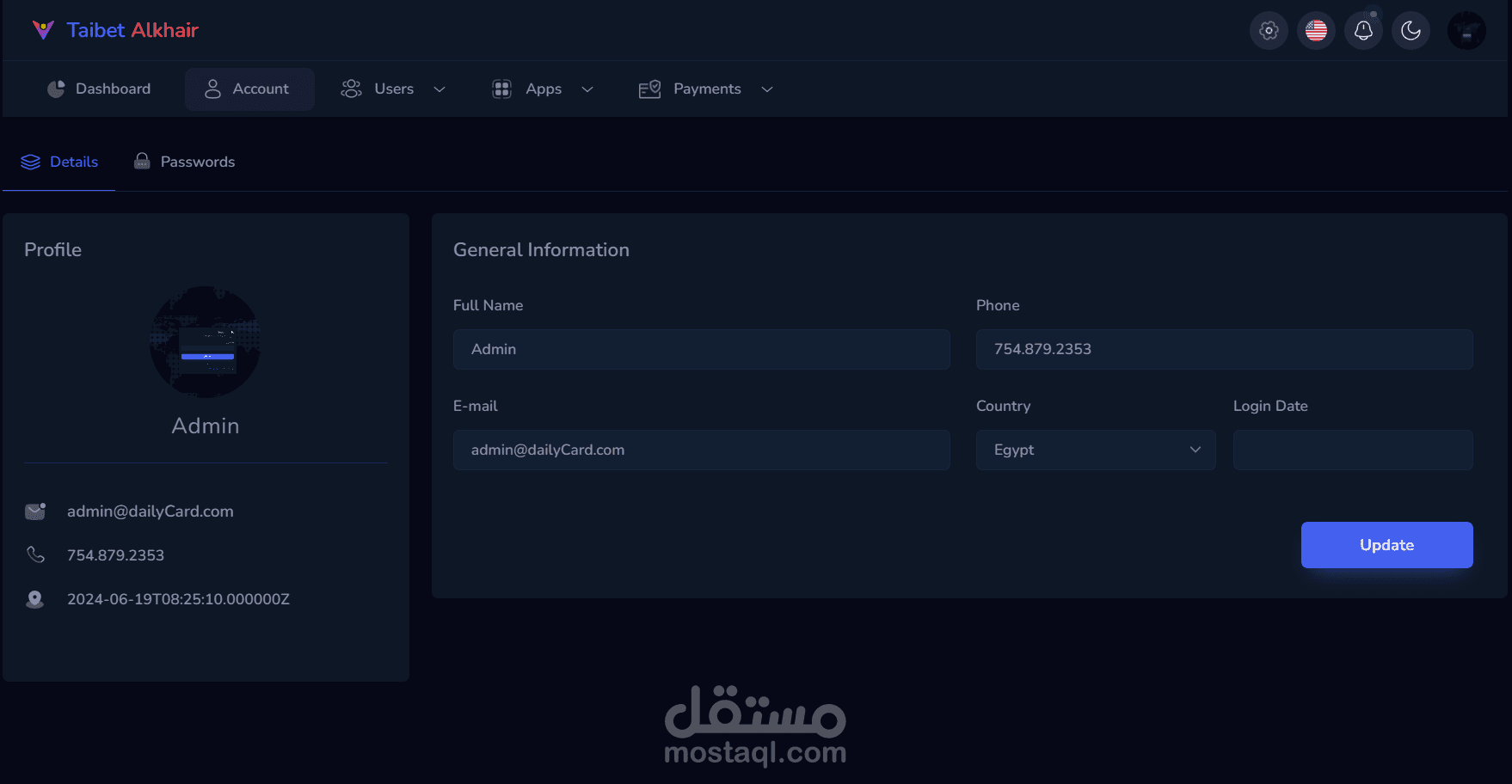 هذا المشروع يعكس خبرتي في تصميم وتطوير لوحات التحكم الاحترافية التي تتناسب مع احتياجات الشركات الكبيرة في مختلف القطاعات.