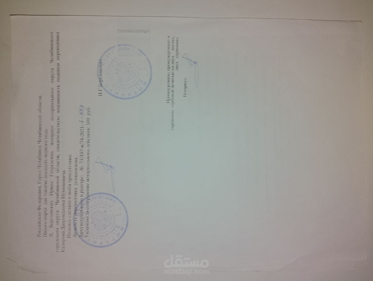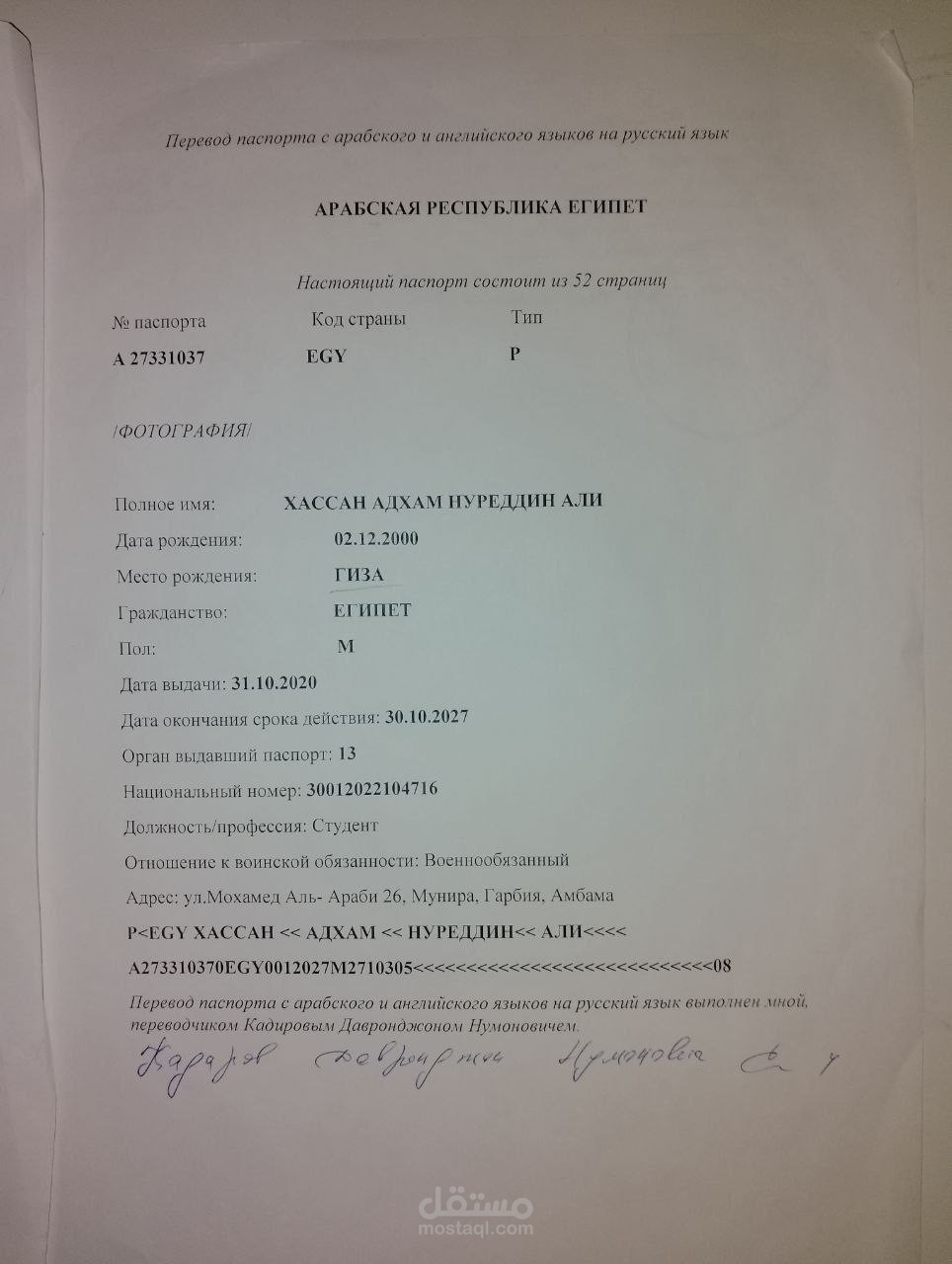 هذه ترجمة لجواز سفر قمت بترجمتها من اللغة العربية إلى اللغة الروسية. تشمل الترجمة جميع البيانات الشخصية لحامل الجواز، بما في ذلك الاسم الكامل، وتاريخ الميلاد، والجنسية، وتاريخ الإصدار والانتهاء، ورقم جواز السفر، بالإضافة إلى كافة التفاصيل الأخرى المدرجة في جواز السفر الأصلي. تهدف الترجمة إلى تقديم نسخة مطابقة تمامًا للوثيقة الأصلية لضمان استخدامها الرسمي والاعتراف بها في الجهات المختصة.