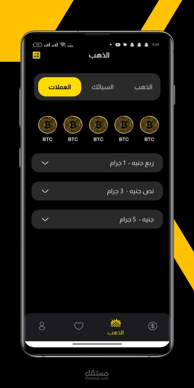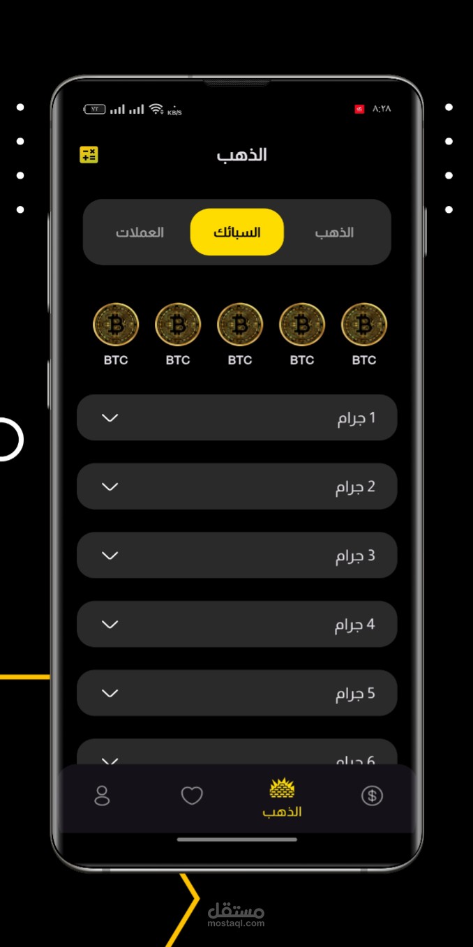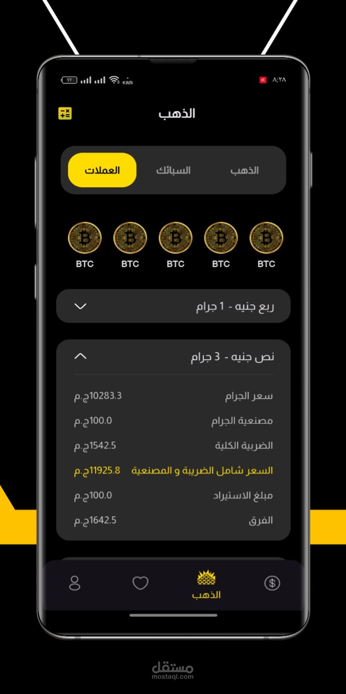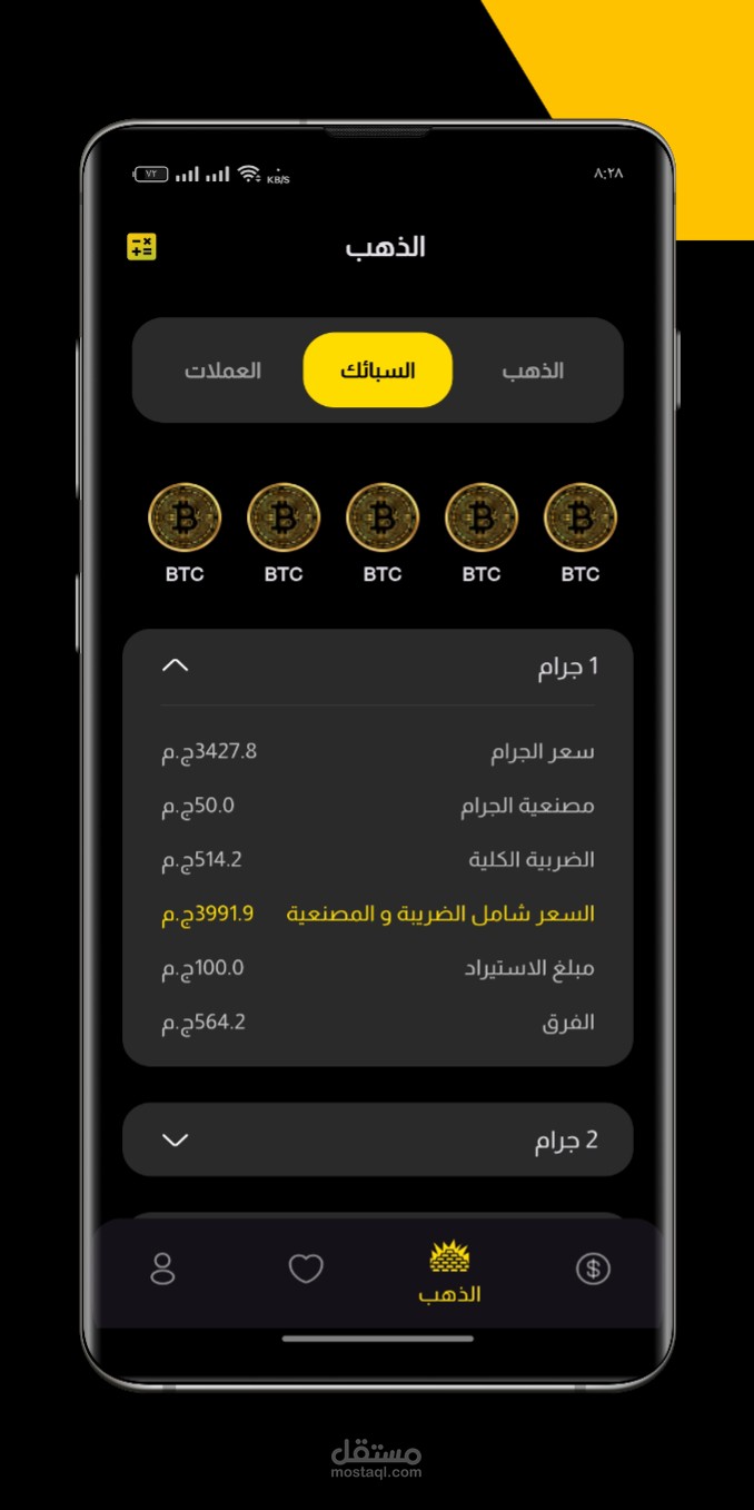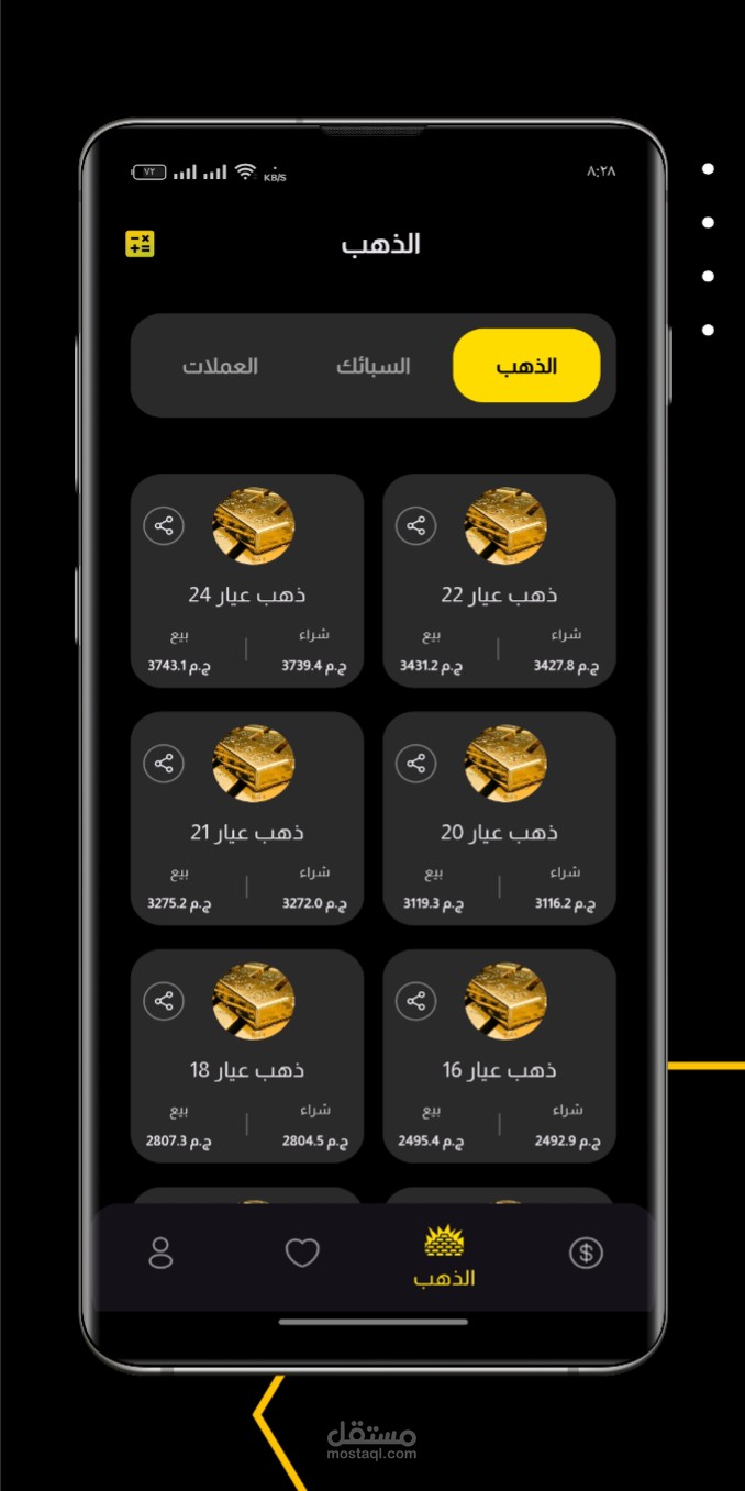 - يعرض التطبيق أسعار الذهب بأحجامه المختلفة، مثل الجرام والأوقية.