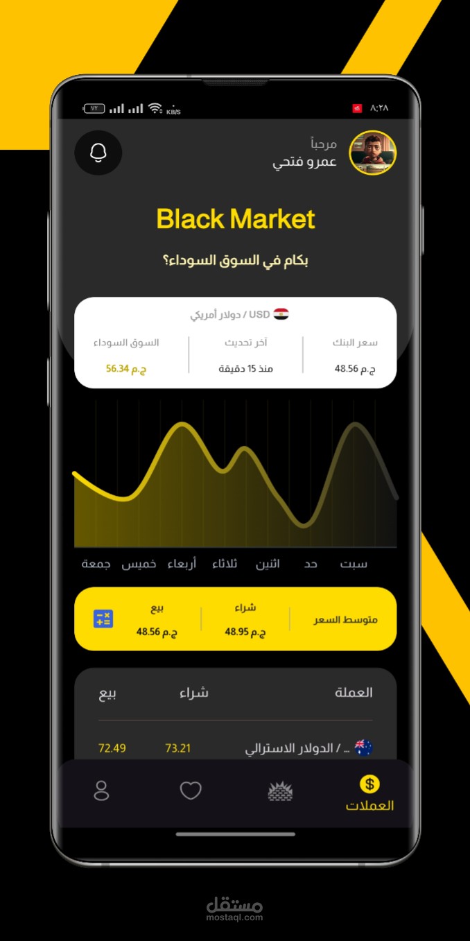 تطبيق "السوق السوداء" هو تطبيق يهدف إلى عرض أسعار العملات في البنوك والسوق السوداء، بالإضافة إلى أسعار مختلف أحجام الذهب. يتم تطوير التطبيق باستخدام تقنيات حديثة مثل Firebase و Firestore و BLoC و REST API، مع التركيز على توفير واجهة مستخدم جميلة واستجابة سريعة.