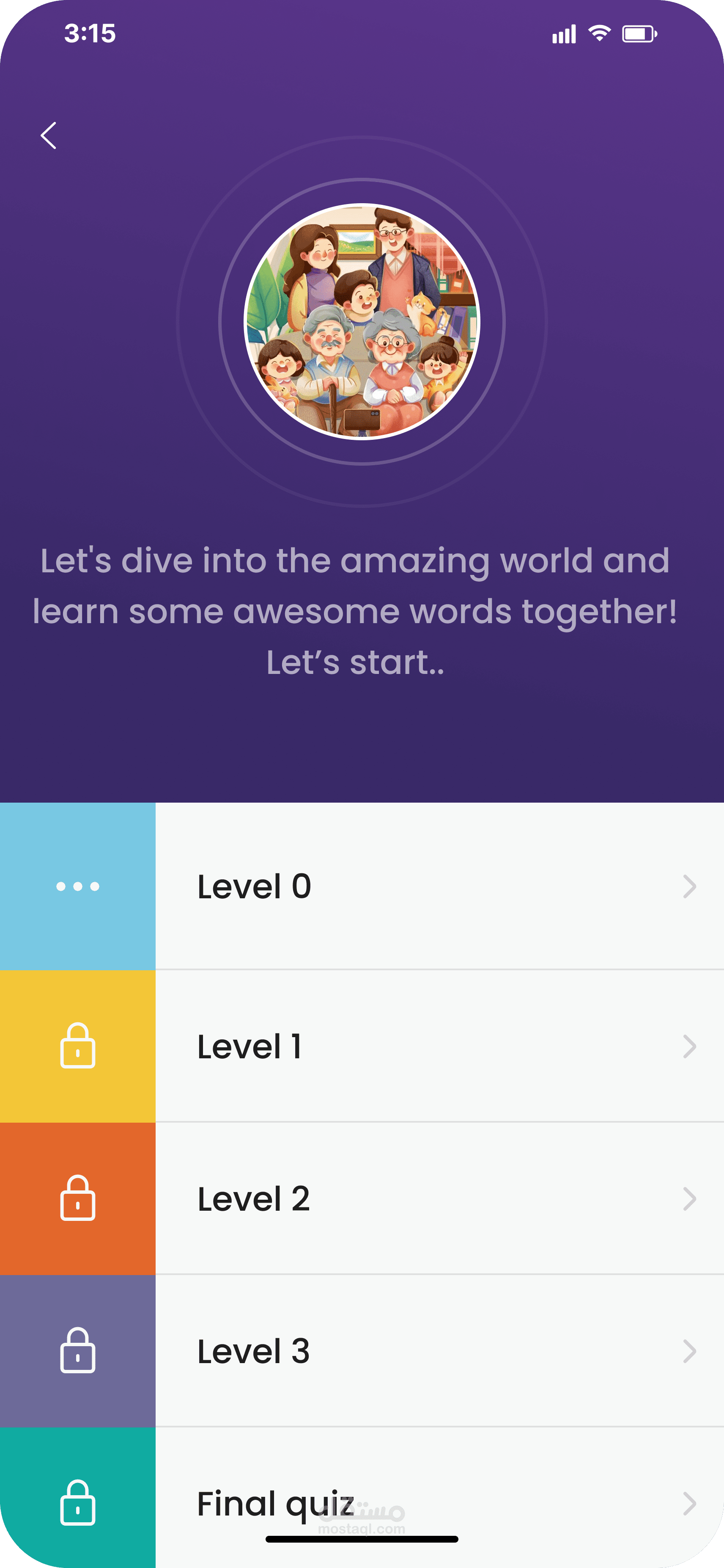 يحتوي كل مستوى على مجموعة من الفئات، وكل فئة تحتوي على سلسلة من القصص.