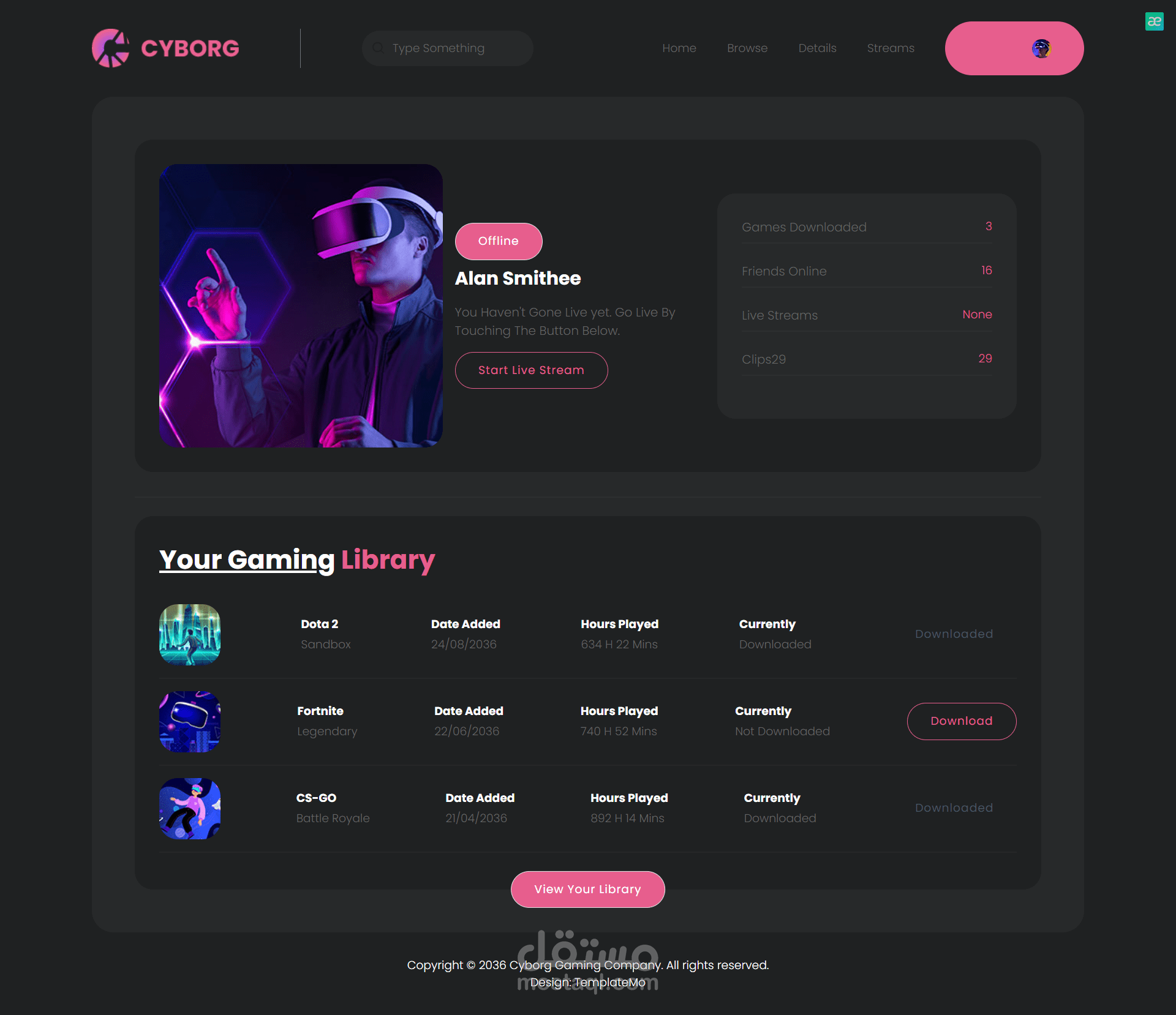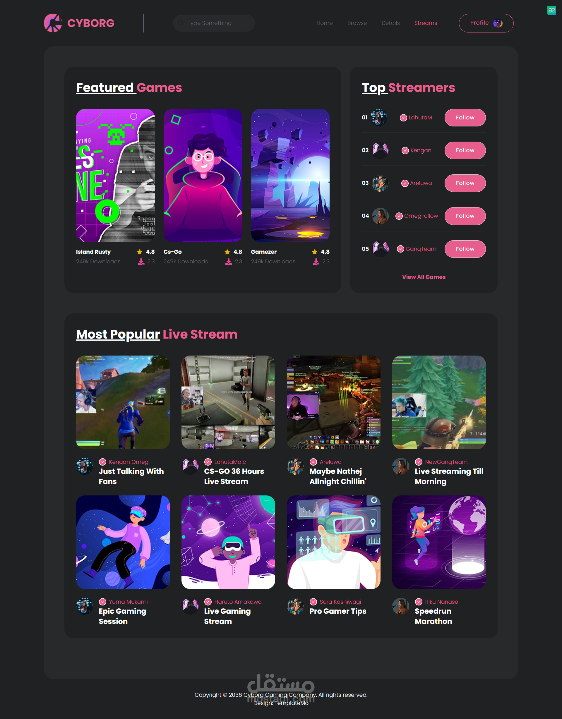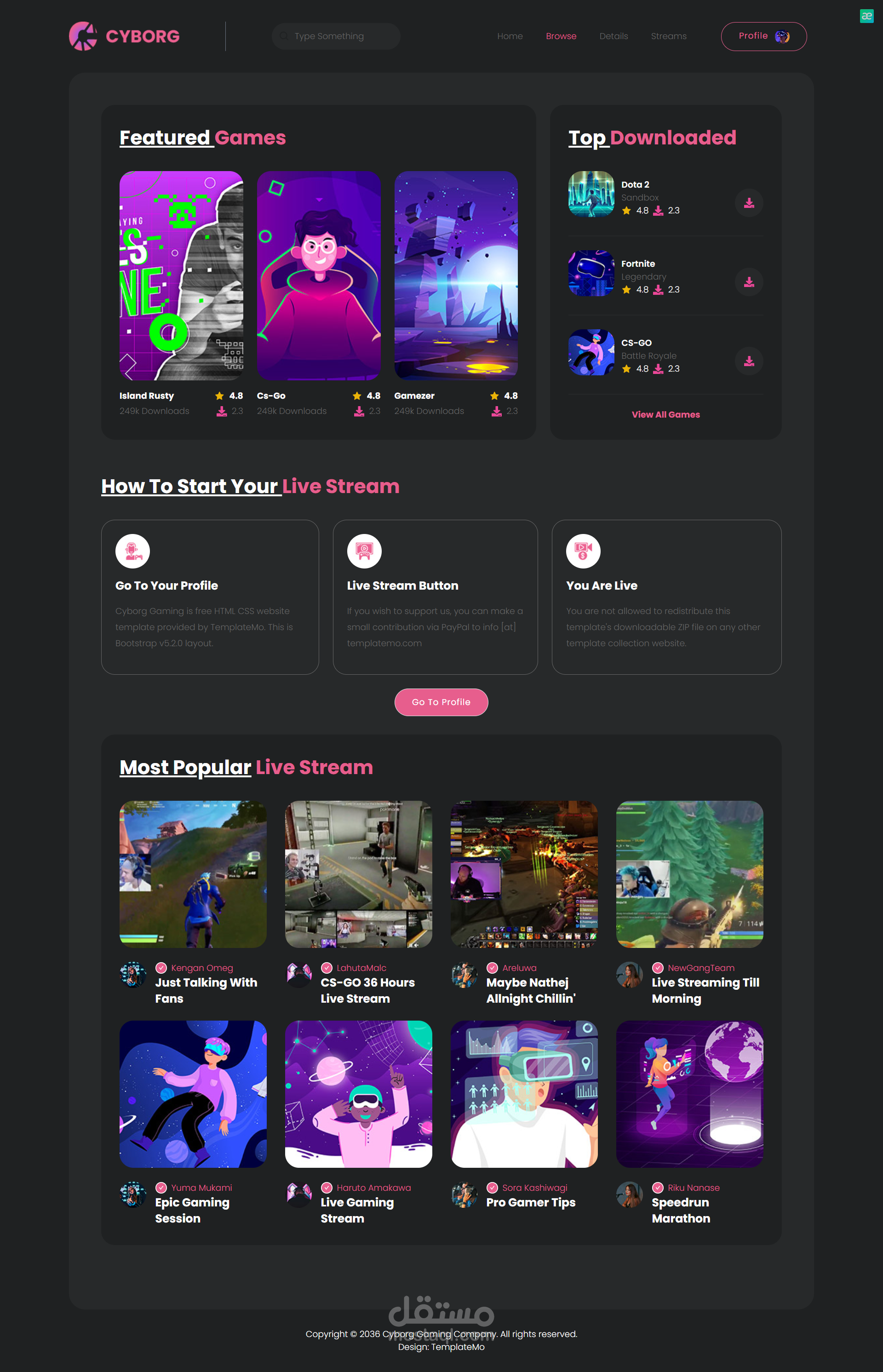 • طوّرت موقع ألعاب يحتوي على صفحة للبث المباشر للألعاب، وصفحة مفصلة للألعاب.
