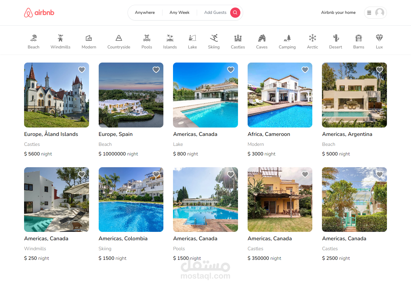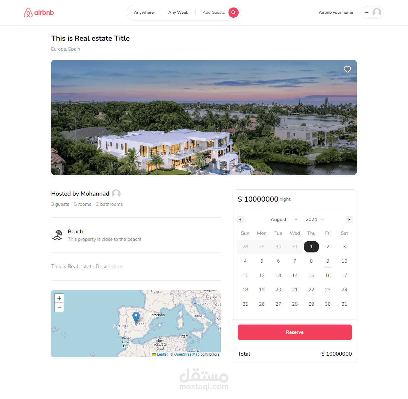 تم تطوير هذا المشروع كنموذج أولي لموقع شبيه بمنصة Airbnb باستخدام التقنيات التالية: Next.js، TypeScript، MongoDB، و Node.js. يهدف هذا المشروع إلى توفير واجهة مستخدم ديناميكية وقاعدة بيانات قوية لإدارة واستعراض العقارات المتاحة للإيجار.