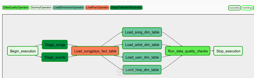 This project establishes an automated and monitored ETL pipeline for the music streaming data warehouse. Apache Airflow orchestrates the data movement process from S3 to Redshift, utilizing custom operators to perform specific tasks. Data quality checks are implemented to ensure data integrity throughout the pipeline. Real-time monitoring capabilities within Airflow provide insights into the overall workflow execution and facilitate proactive issue identification.