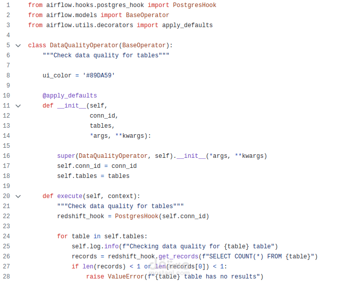 The `data_quality.py` operator performs checks on the loaded data to ensure accuracy and consistency. These checks can be customized based on specific data quality requirements.