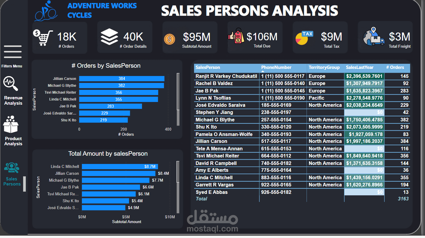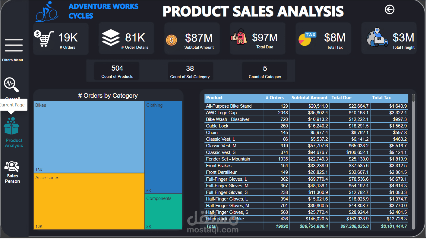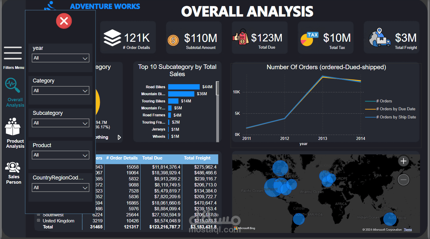 باستخدام قاعدة بيانات "AdventureWorks OLTP"، قمت بتحويلها إلى star schema وقمت بإنشاء لوحة تحكم تفاعلية. توفر هذه اللوحة تحليلًا شاملاً لأداء المبيعات، بما في ذلك: