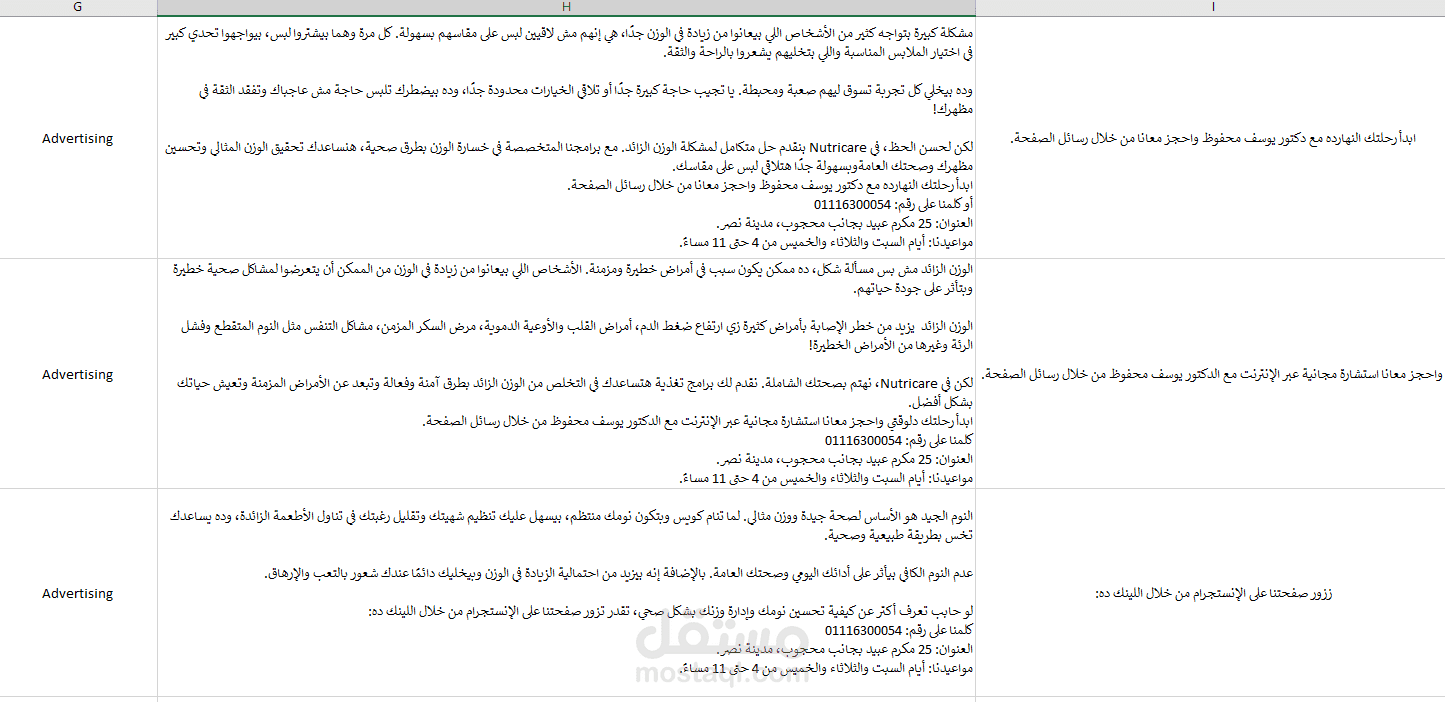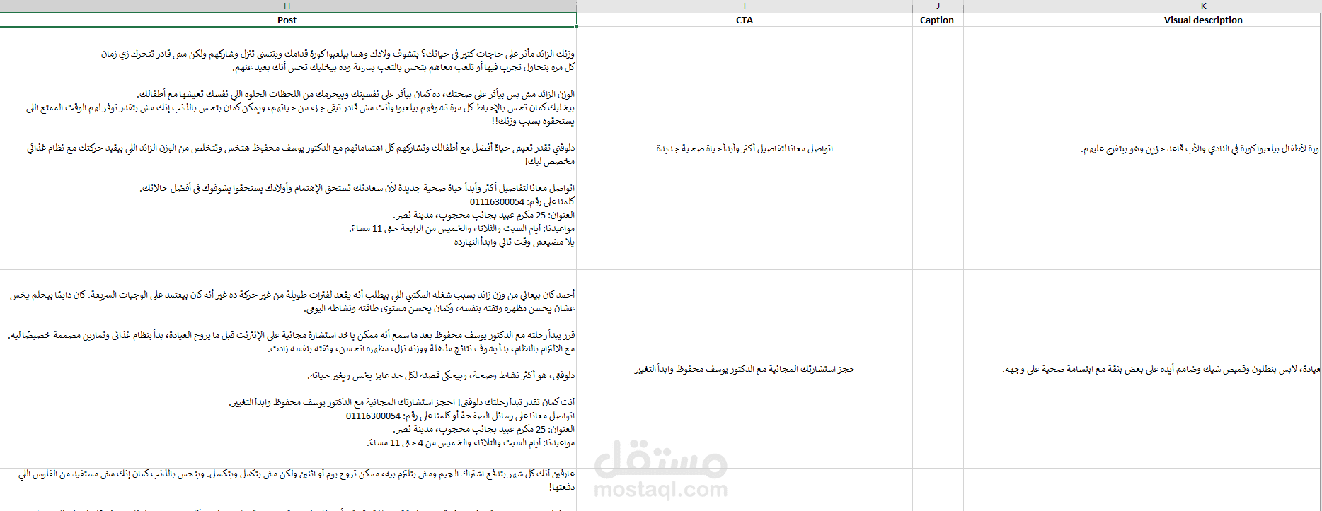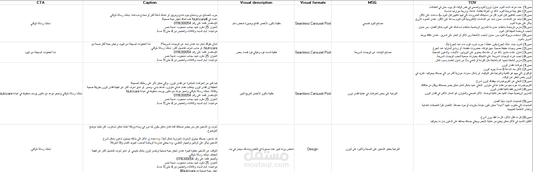 شاملة المحتوى مكتوب - العميل المستهدف - المحتوى موجه للعميل في أي مرحلة - وصف للمحتوى المرئي الذي ينزل على المحتوى الكتابي.