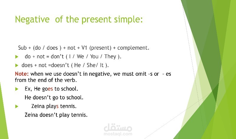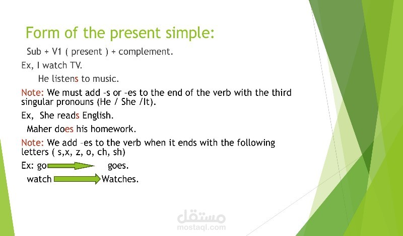 - لقد قمت بتوضيح كيفية تكوين الجمل المثبتة في الزمن المضارع البسيط باستخدام الفعل في صورته الأساسية مع إضافة (s) للفعل مع الضمائر المفردة. ( He ,She ,It)