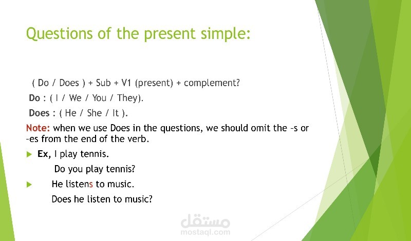 - كيفية تكوين الجمل الاستفهامية باستخدام الفعل المساعد "do" أو "does" في بداية الجملة.