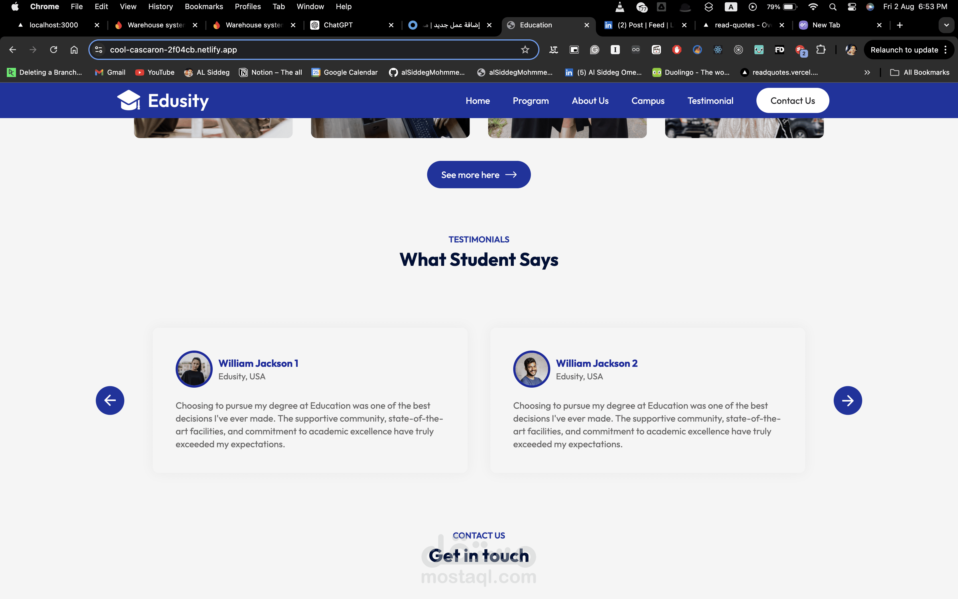 هذا الموقع التعليمي يوفر منصة للطلاب والمعلمين للتفاعل مع المحتوى التعليمي. تم تطويره باستخدام ReactJS للواجهة الأمامية، Node.js للواجهة الخلفية، و MongoDB لقاعدة البيانات.