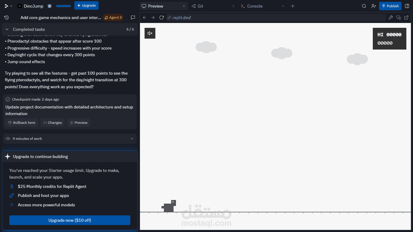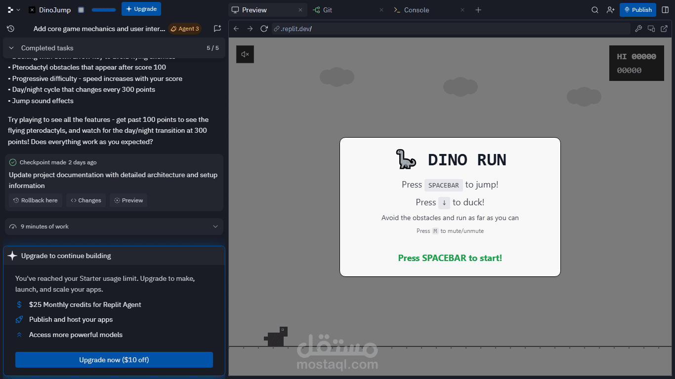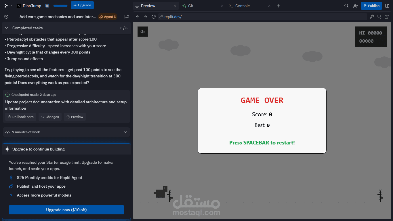 لعبة ويب بسيطه عباره عن لعبة الديناصور مسليه وبدات بيها عملتها من خلال موقع REPLIT
